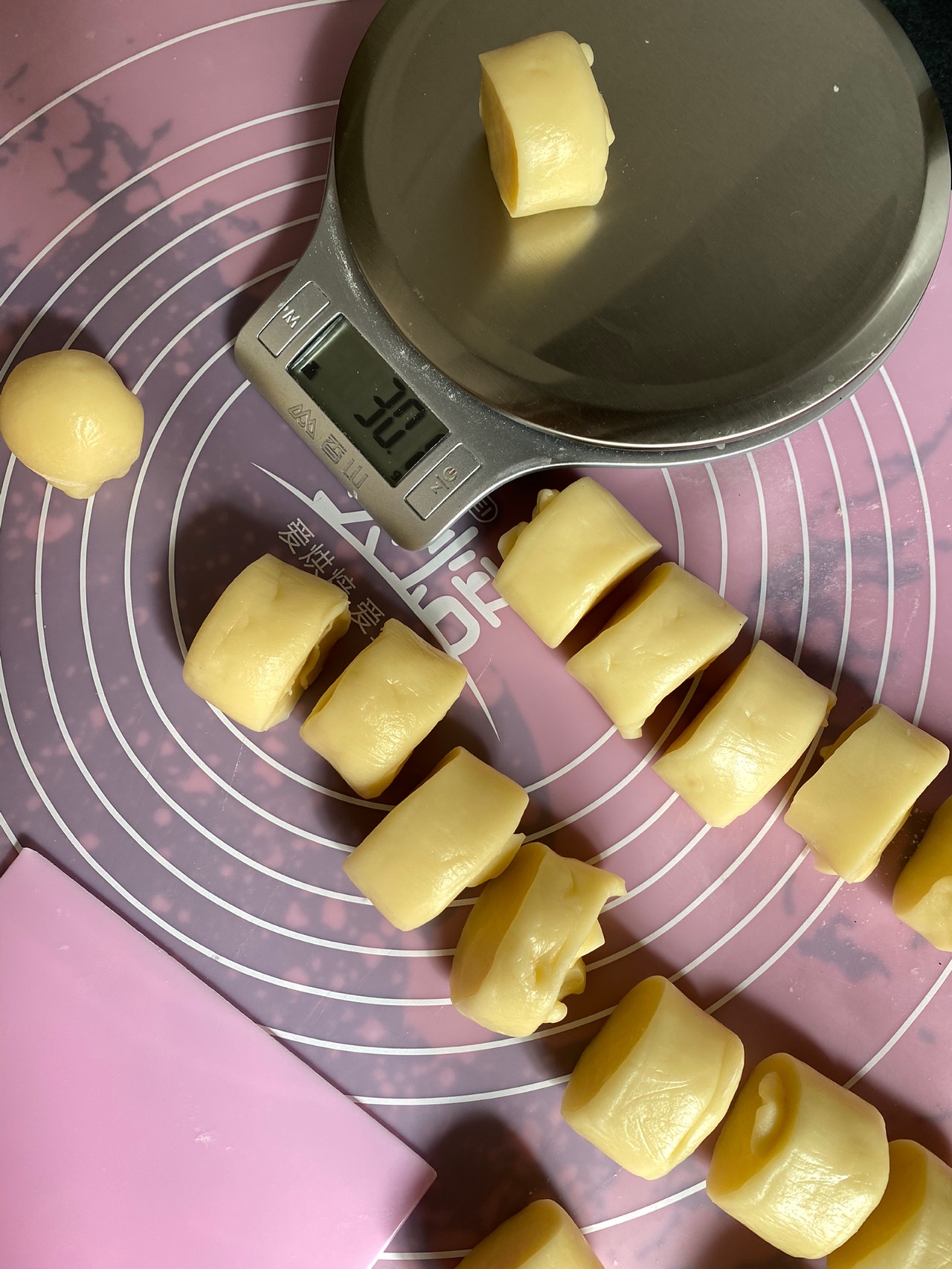 步骤10、撒粉,切小块儿。每个30克,称出来的就是整整20个。
