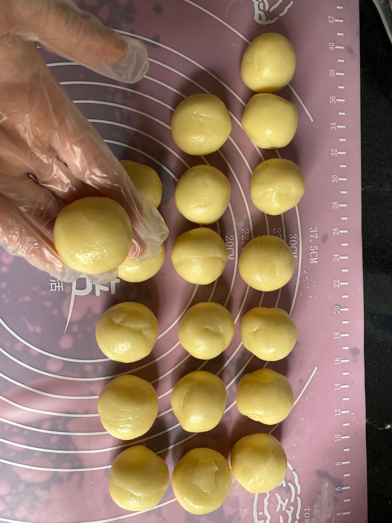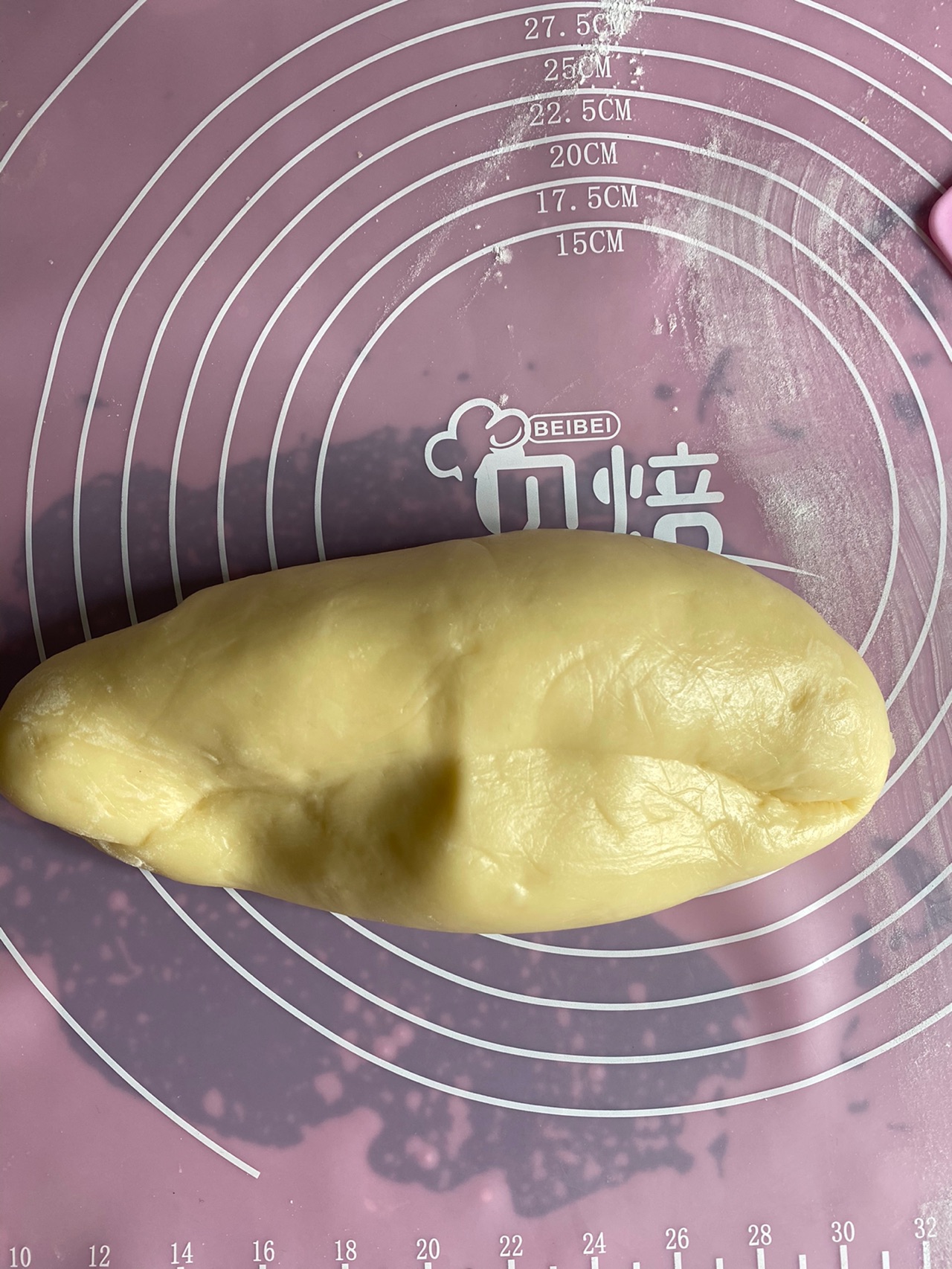 步骤8、冷藏好的雪梅娘皮稍微揉几下整形,如果觉得粘手就撒上熟粉。(揉的过多手温会让面团变软)
