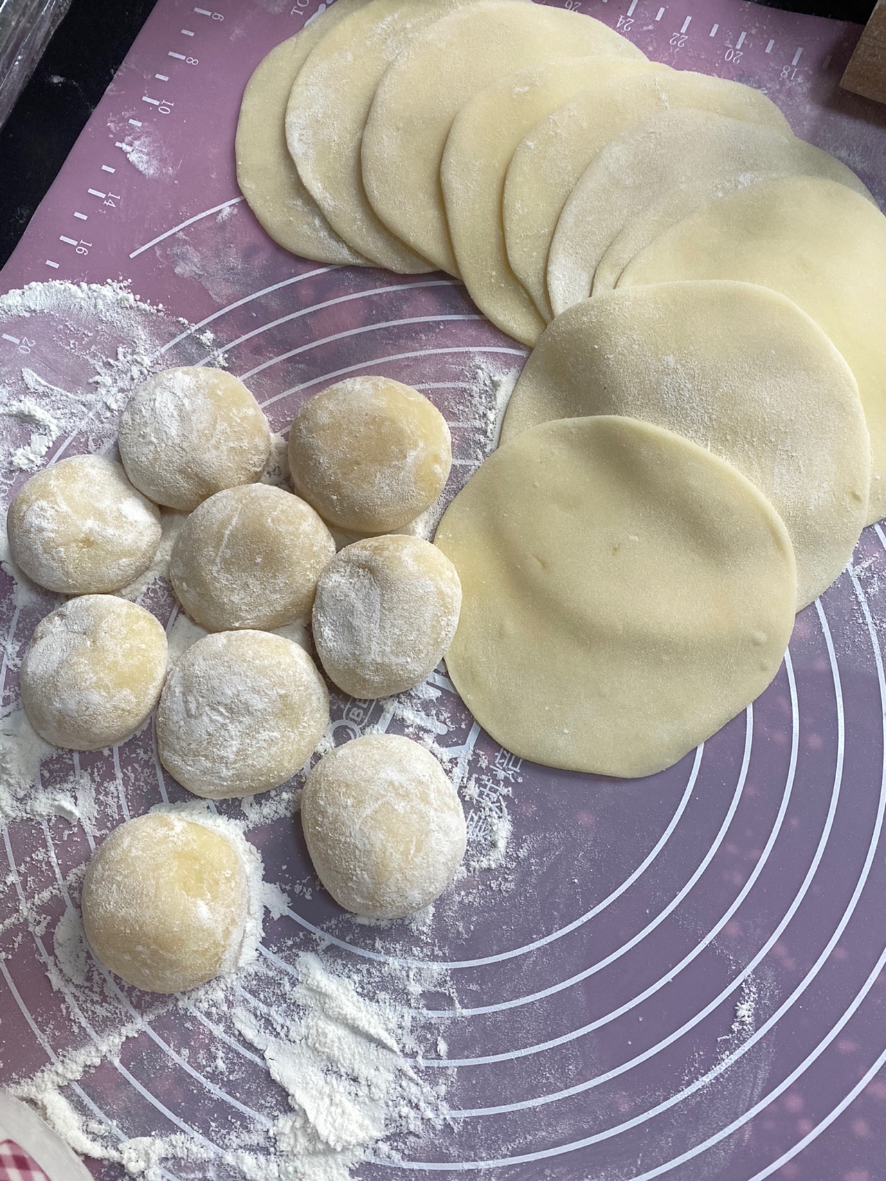 步骤12、压扁,撒粉,擀成皮,皮与皮之间保证底部有熟粉防止粘连,盖好保鲜膜继续冷藏!准备水果,打奶油