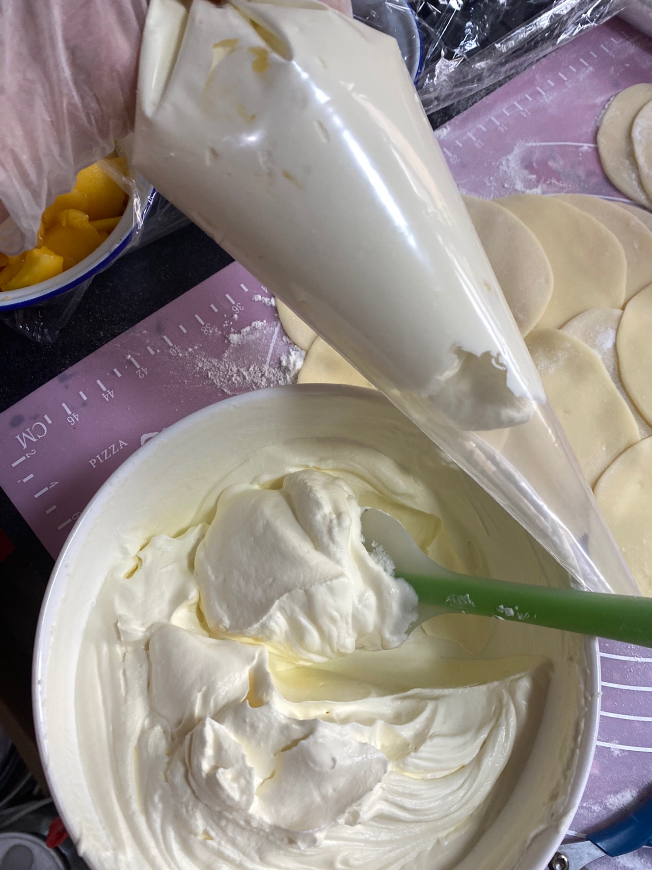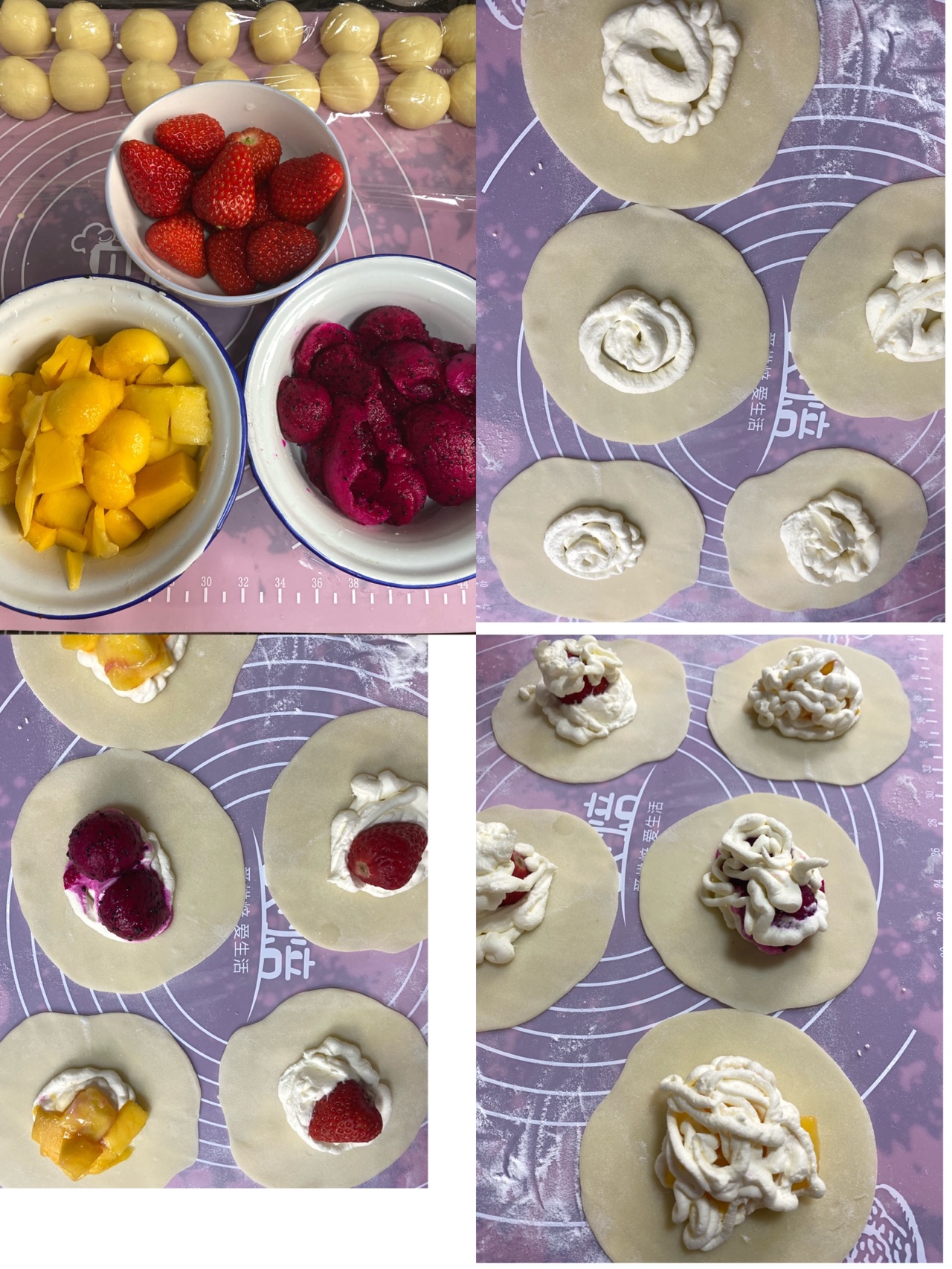 步骤14、挤一点奶油,放几块水果,再覆盖奶油,水果换奥利奥碎就是奥利奥雪媚娘。(尽量用水分少的水果,草莓/芒果/香蕉/榴莲/火龙果等)