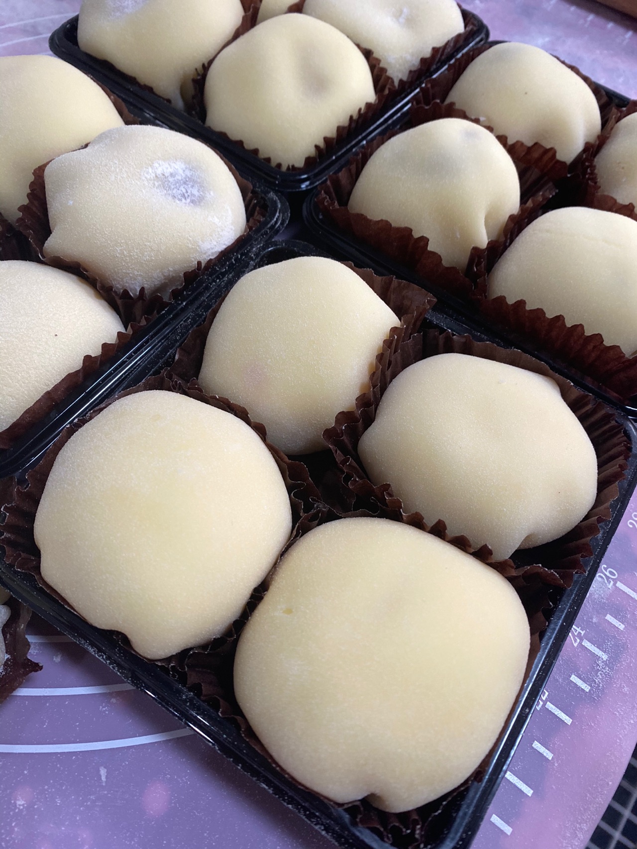 步骤17、翻过来,胖嘟嘟放纸托,装盒,水果雪媚娘成品75g/个。