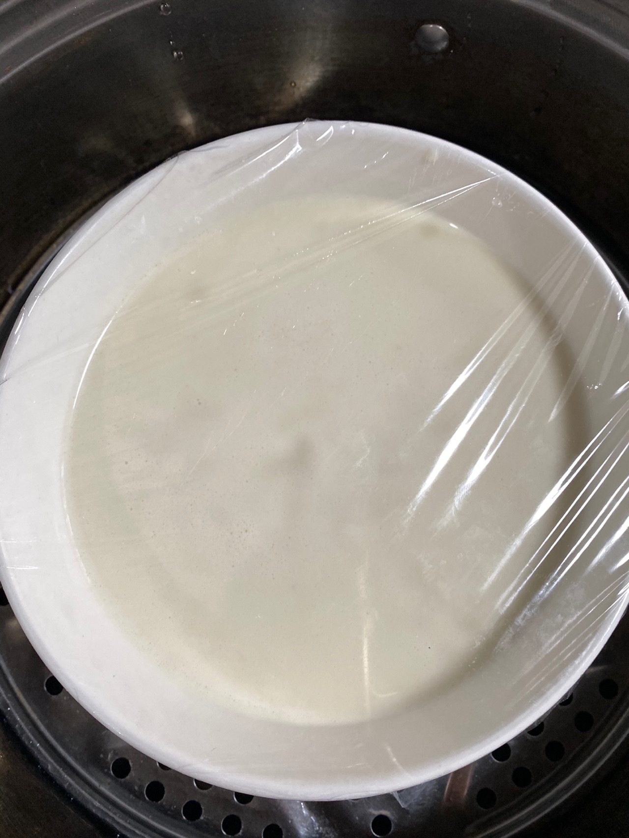 步骤3、搅拌,面糊会有块状粉类,用面粉筛过滤。盖保鲜膜,用牙签在保鲜膜上戳一些孔,冷水上锅!盖上锅盖,隔水蒸40分钟,大火上气后转中小火,蒸制时间要根据减量或者翻倍而相应缩短或者增加。