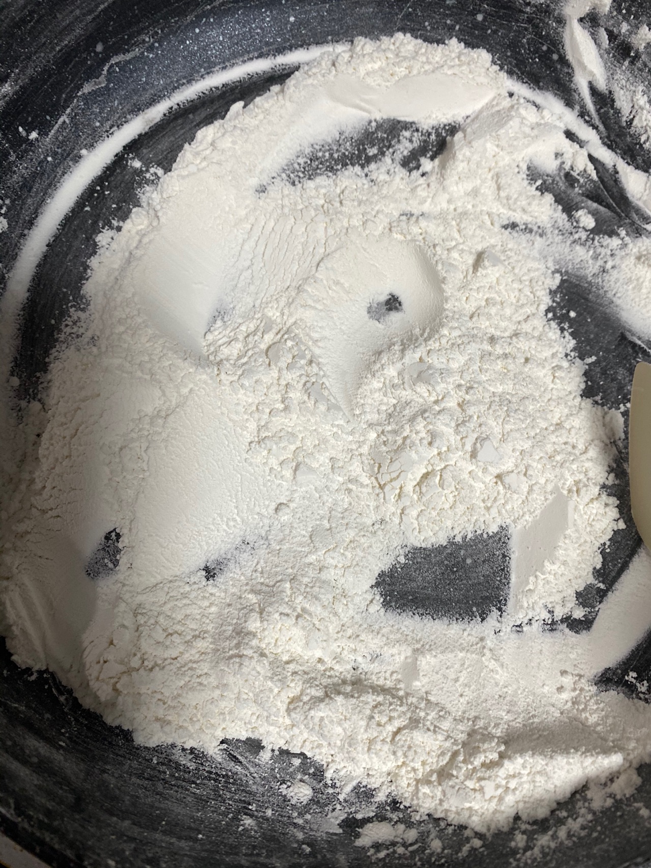 步骤2、将150g糯米粉和45g玉米淀粉过筛入盆中,放进100g白砂糖,加入270g牛奶。