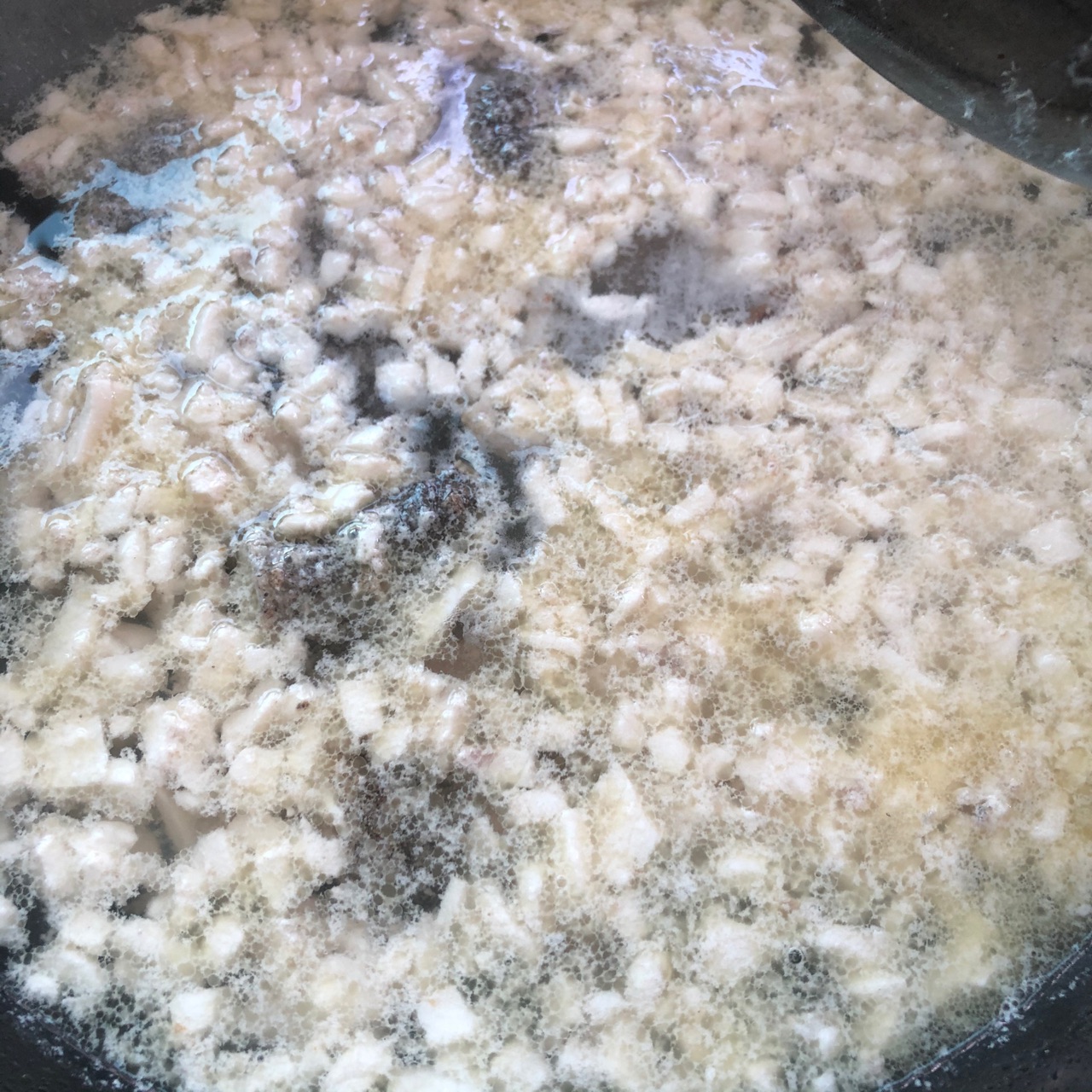 步骤3、热锅冷油烧热,加鱼皮鱼骨煎微焦加蒜末,倒入开水