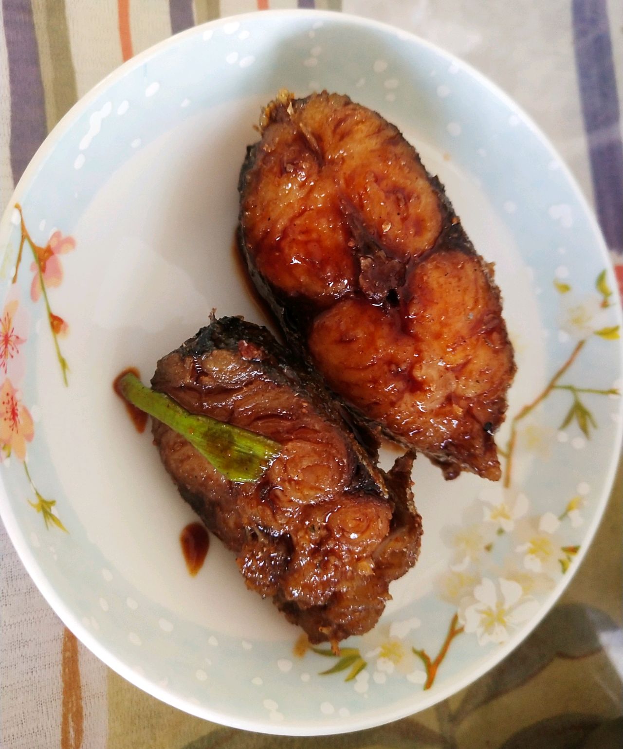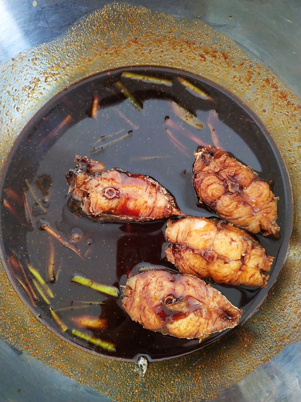 步骤5、鱼块放入汤汁中正反面蘸一下取出装盘