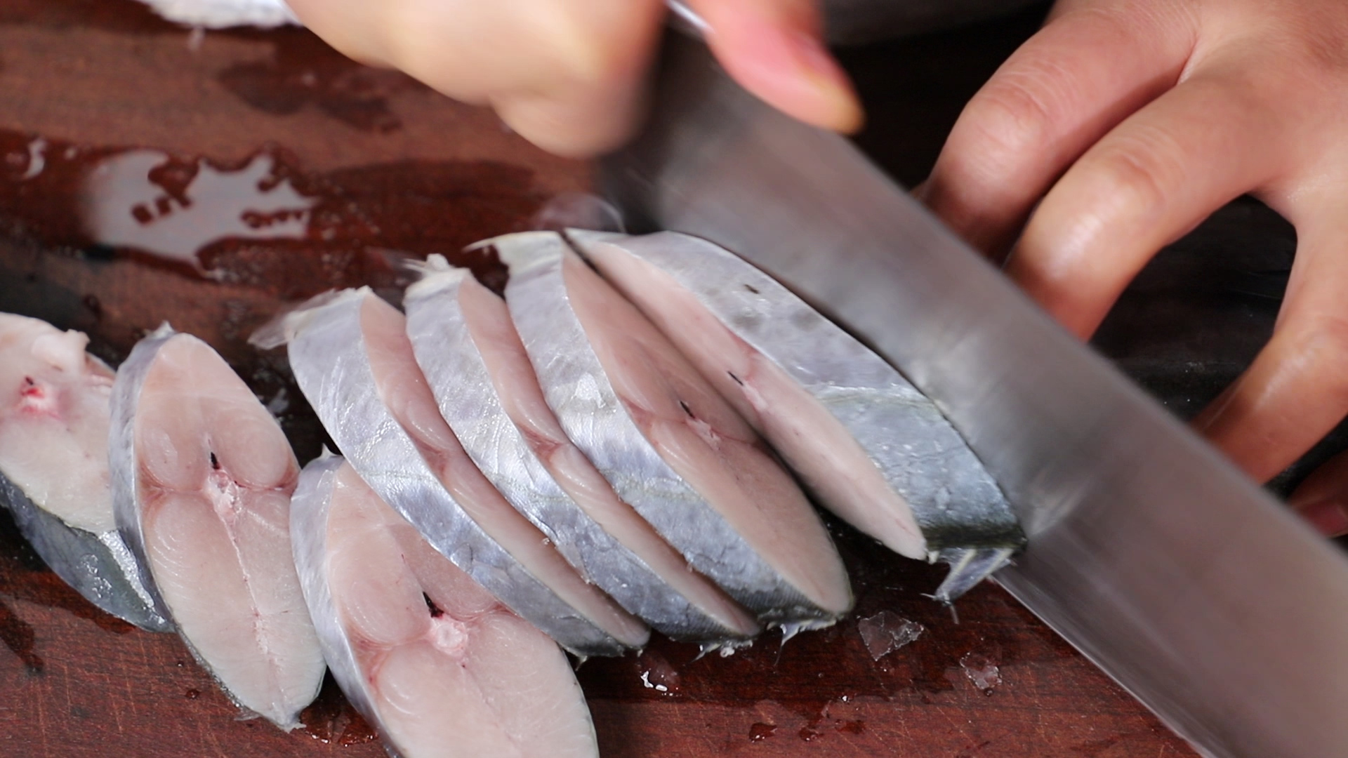 步骤1、鲅鱼冻一下切成1cm厚的片,冻一下切肉不容易散,还好切