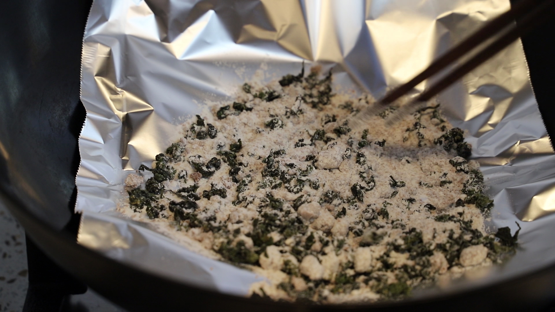 步骤10、锅中垫一张锡箔纸,倒上熏料