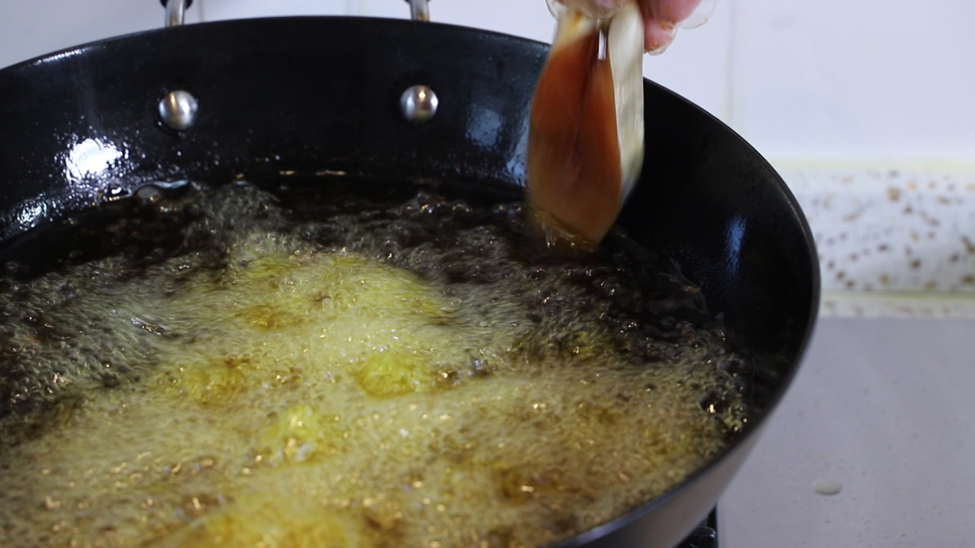 步骤7、油锅7层热,贴锅边下入鲅鱼炸,炸5分钟左右