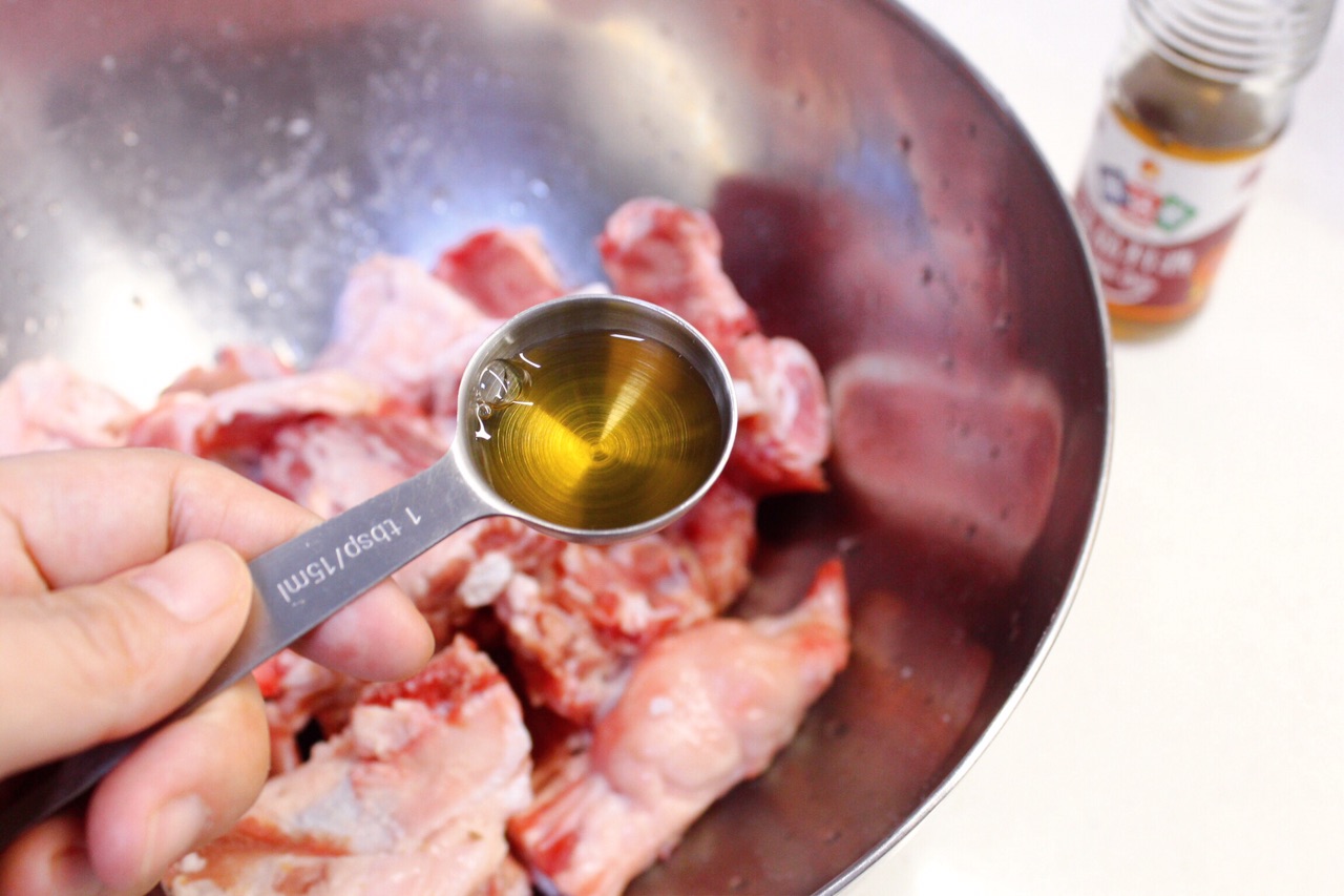 步骤2、羊蝎子洗净沥干后加入味达美臻品料酒2勺,腌一下去腥;