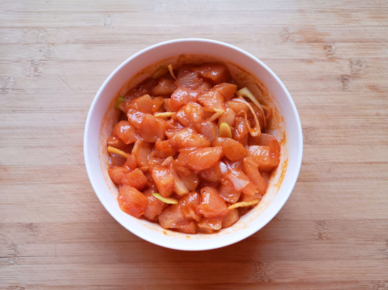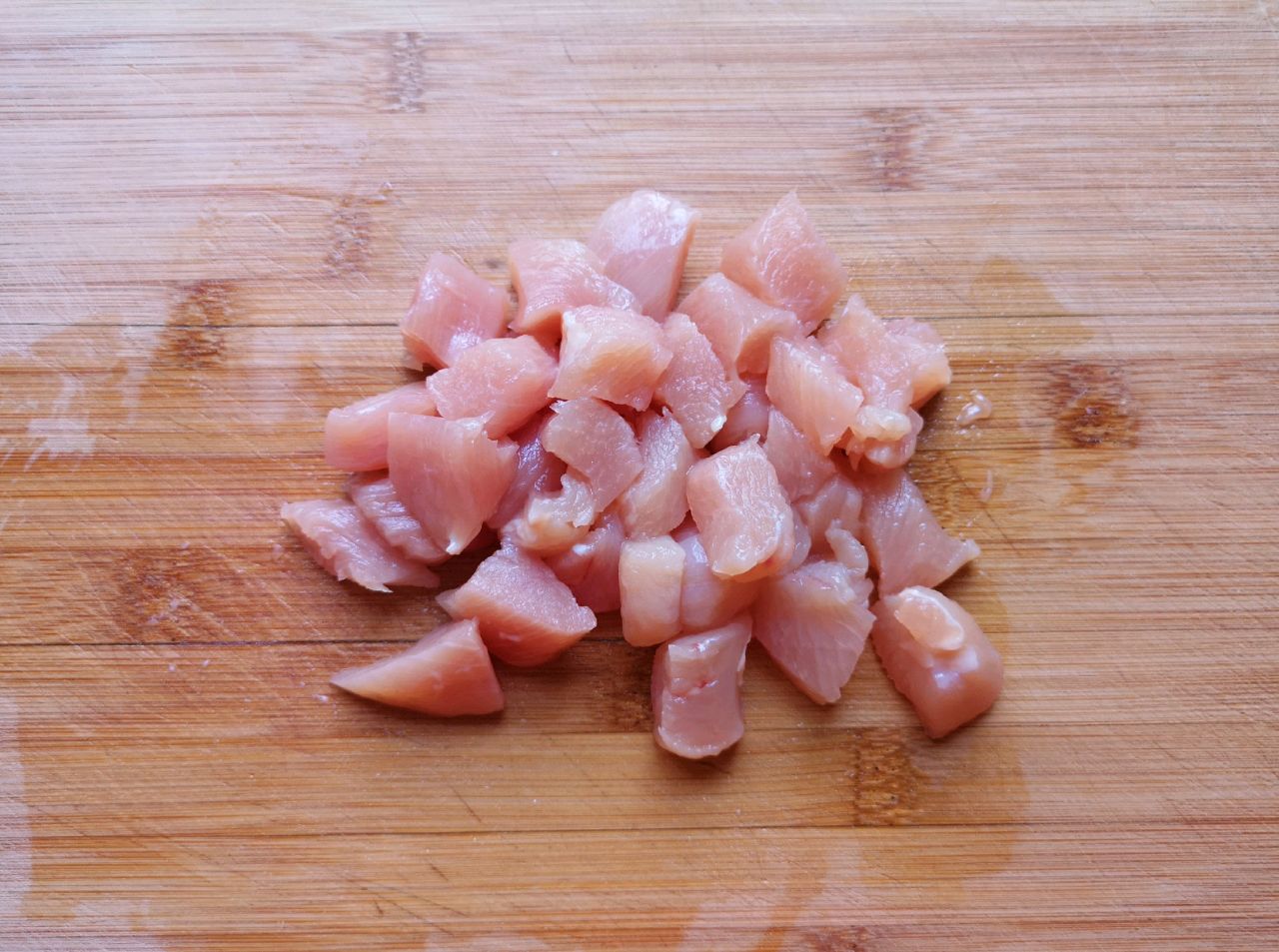 步骤1、鸡脯肉洗干净,切成1厘米大小的块状。