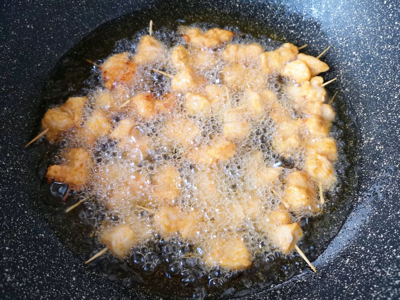 步骤11、全部炸完以后,将锅里的油继续加热至高温,下入肉肉复炸30秒即可捞出。