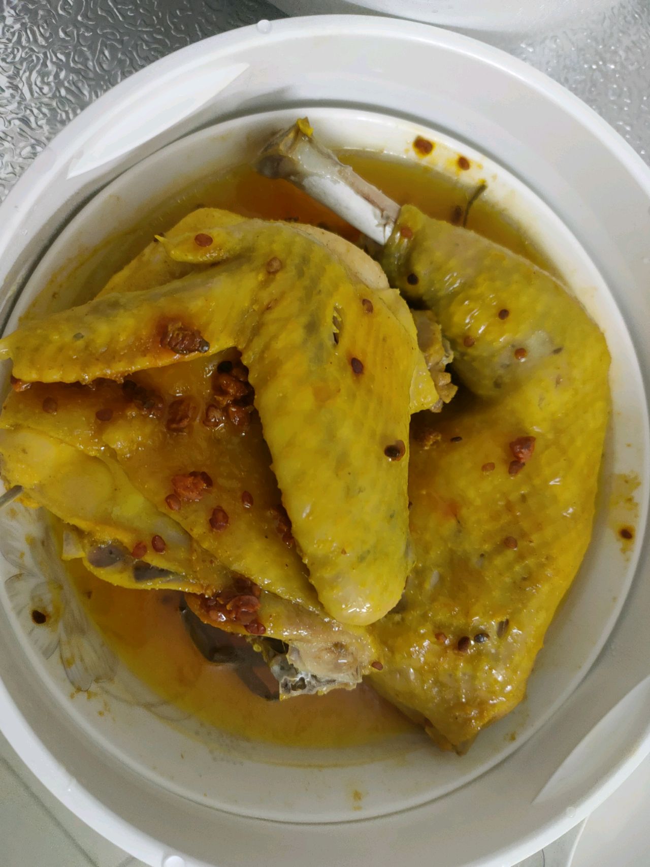 步骤1、鸡肉洗干净,放耗油,盐,白糖,盐焗粉,黄栀子,还有香油,大葱,搅拌好出颜色,放置一个小时左右,记得多翻动比较入味。