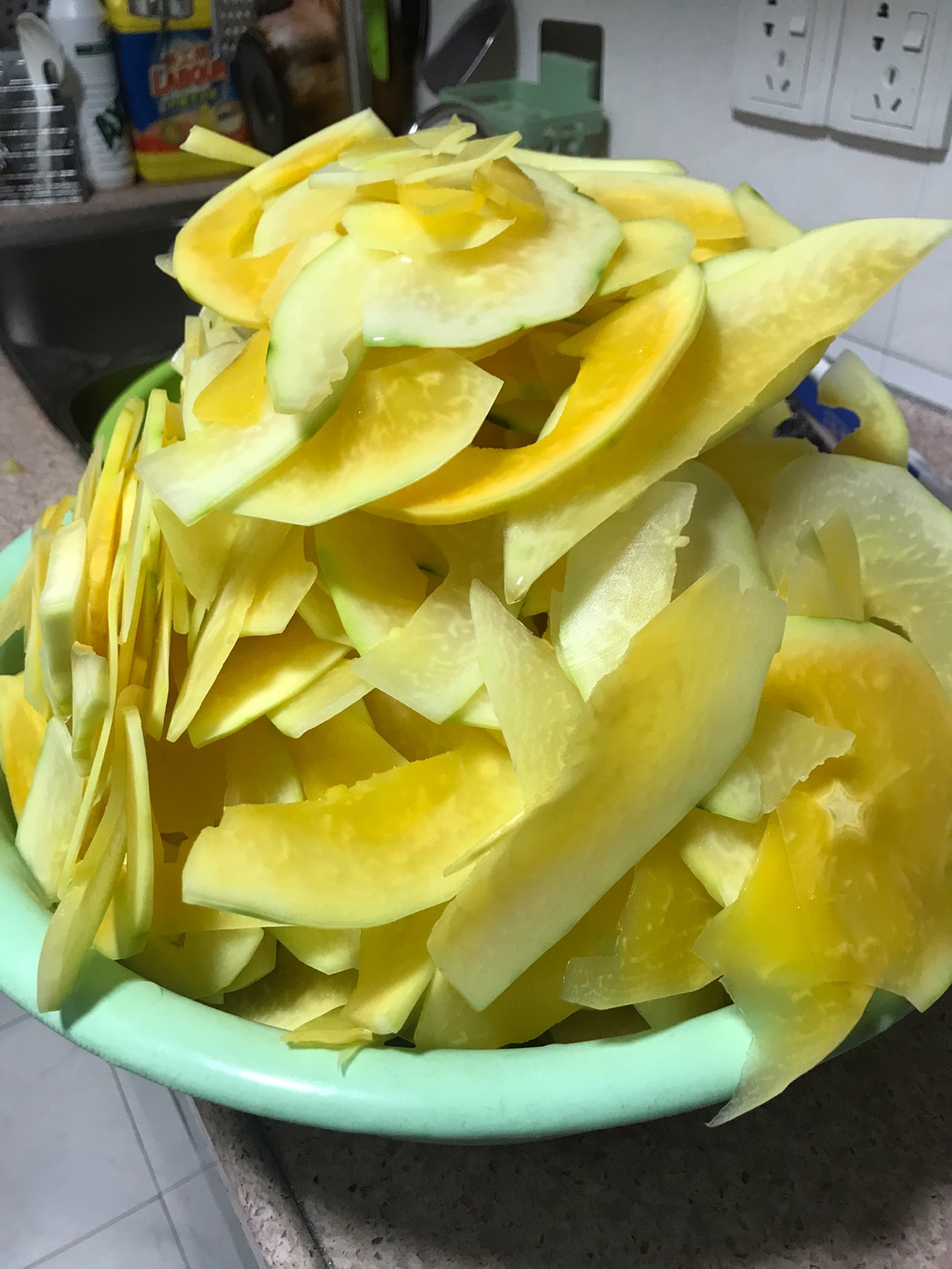 步骤1、木瓜切片,不要切的太厚,切好木瓜,然后放石灰粉加水到入木瓜,水淹过木瓜,淹6个小时左右,也可以看木瓜有没有淹脆而判断是否淹好
