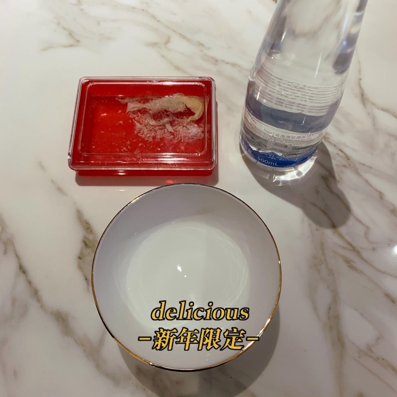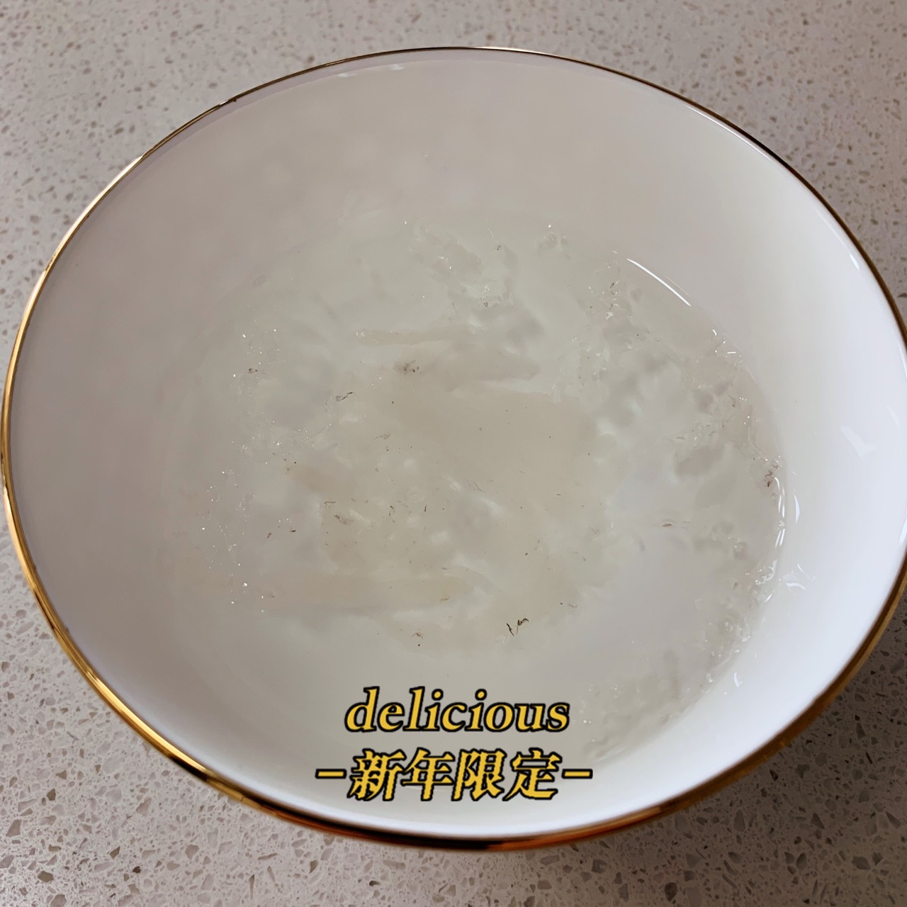 步骤1、泡发燕窝:提前一晚将燕窝浸泡入纯净水,放进冰箱冷鲜室<0°C,8h><低温泡发虽然耗时,但能更好地锁住燕窝的胶原蛋白等营养物质>