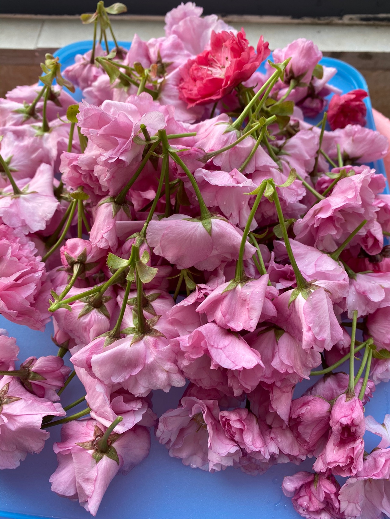 步骤1、春天的时候采八重樱花适量,清水洗干净。不要开太大的,开太大一碰就散了