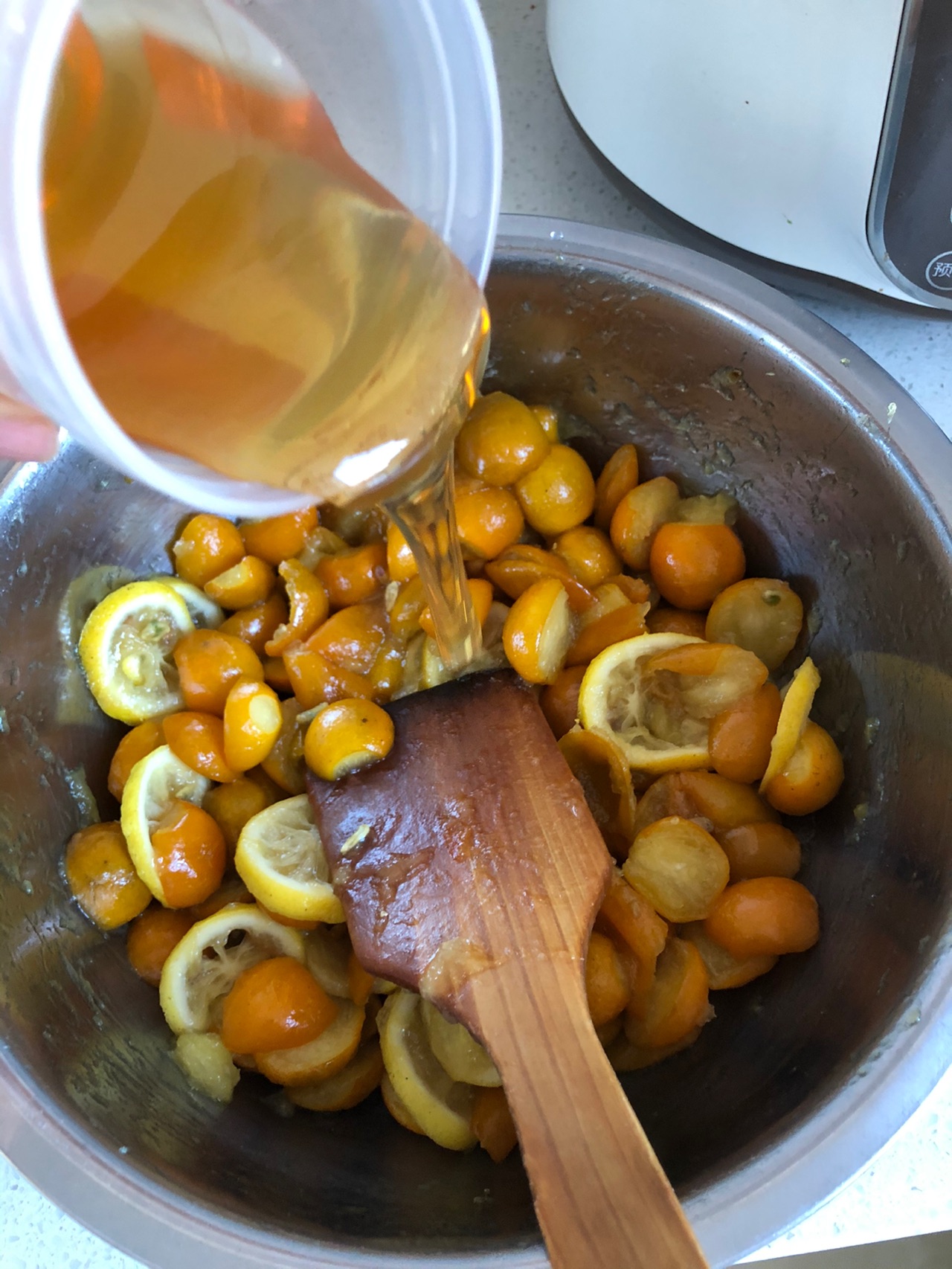 步骤4、熬好的金桔柠檬,放凉后,再倒入蜂蜜,就做好了。