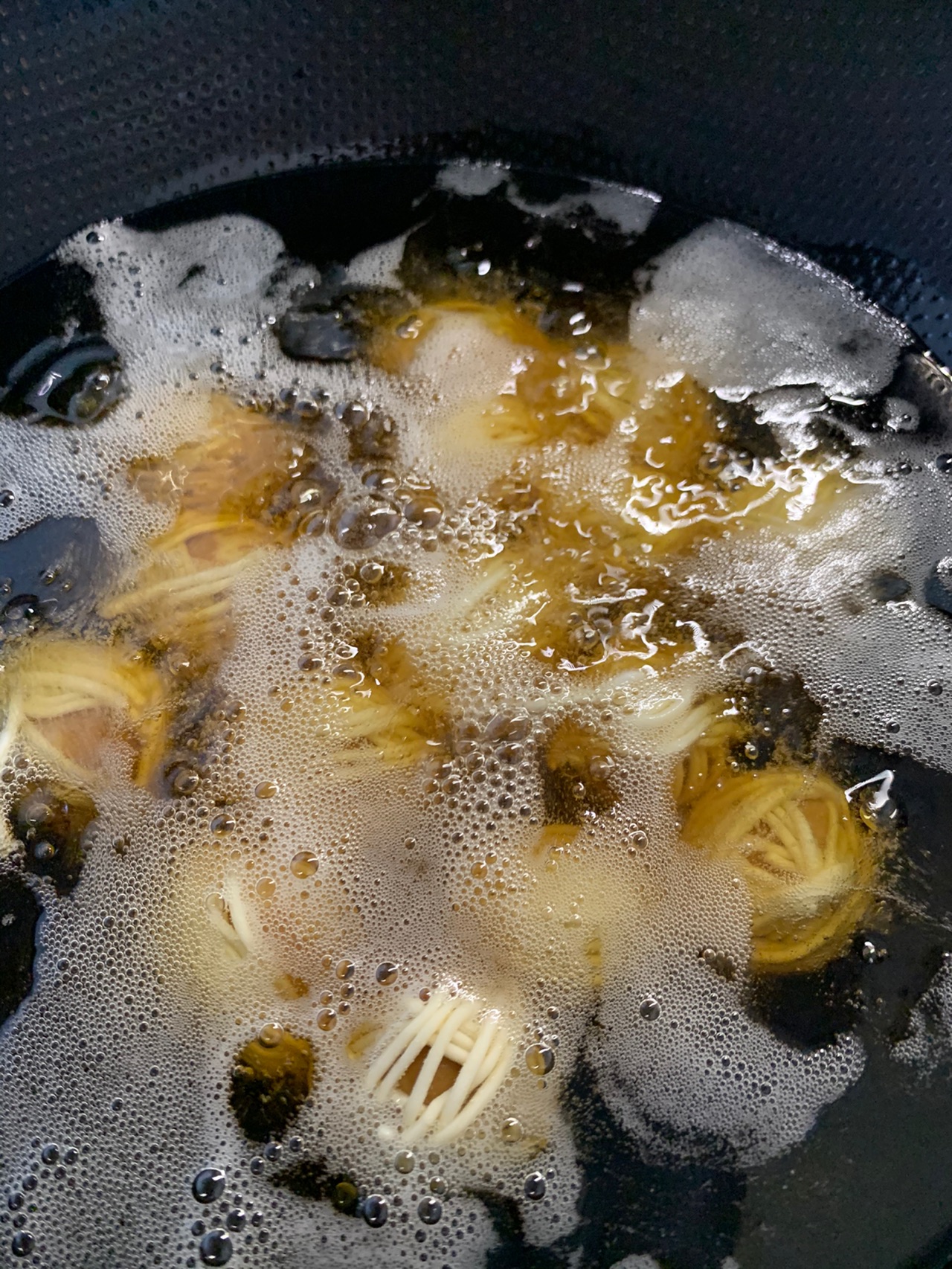 步骤12、中小火,炸............这个时间我没看,但是估计应该有十分钟以上,因为面条是生的,我们是用油把它炸熟等炸到面条变硬,捞出来,大火把油烧开,再复炸一遍,只需要1,2分钟即可