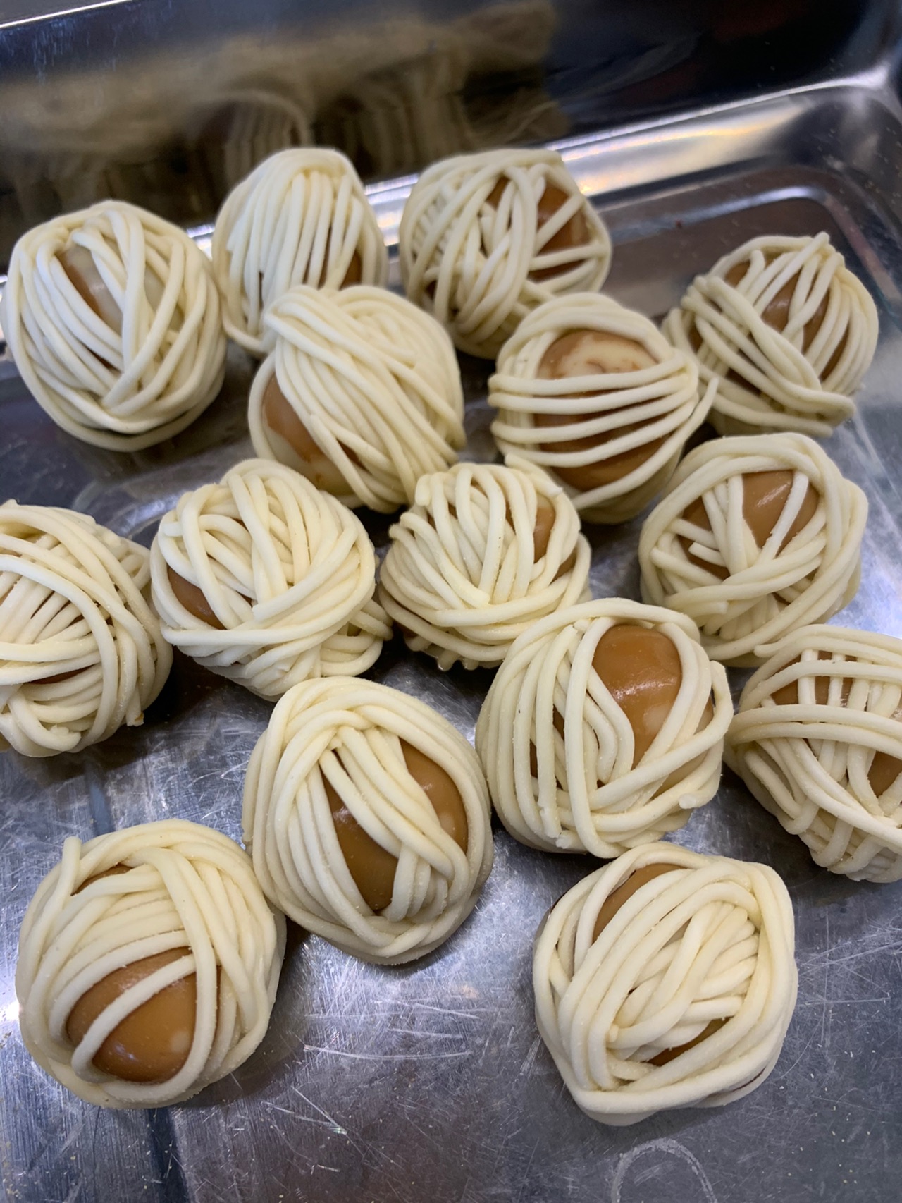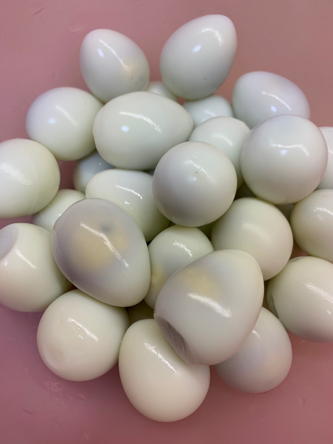 步骤8、看出来鹌鹑蛋被腌制一晚颜色的变化了吧,然后就是把生面条缠在鹌鹑蛋上面