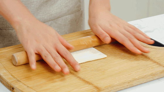 步骤6、将馄饨皮4-5张叠在一起,用擀面杖擀薄