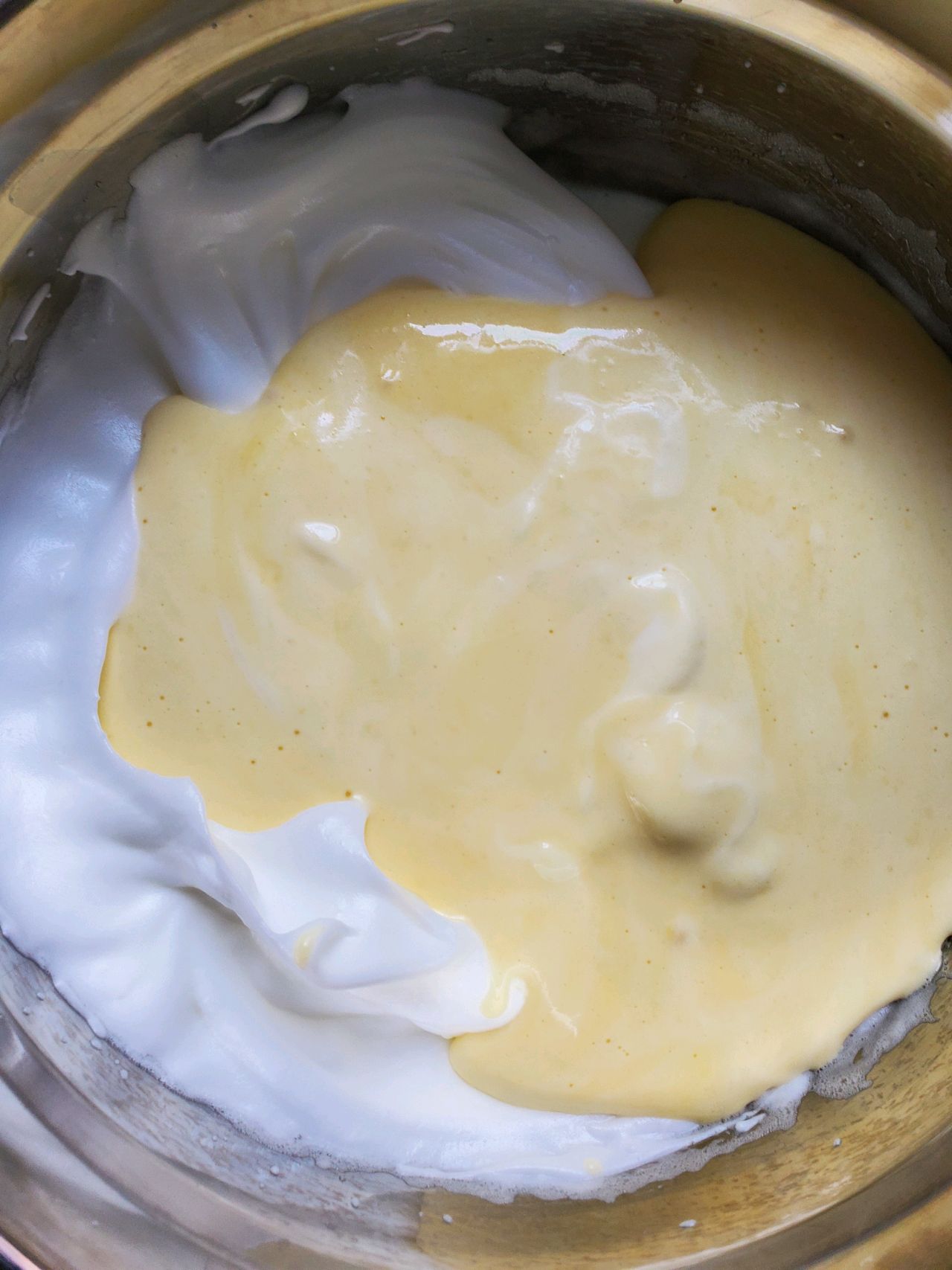 步骤8、再将全部蛋黄糊倒入蛋白中翻拌均匀