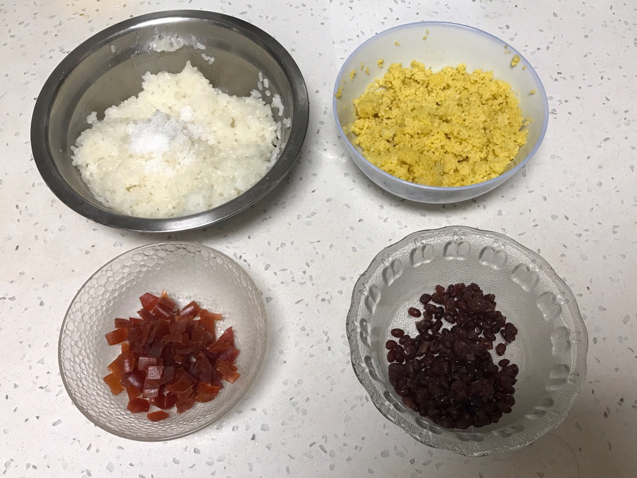 步骤4、蒸熟的小米和糯米取出,准备了果丹皮,蜜豆……你也可以准备你喜欢吃的其他果干