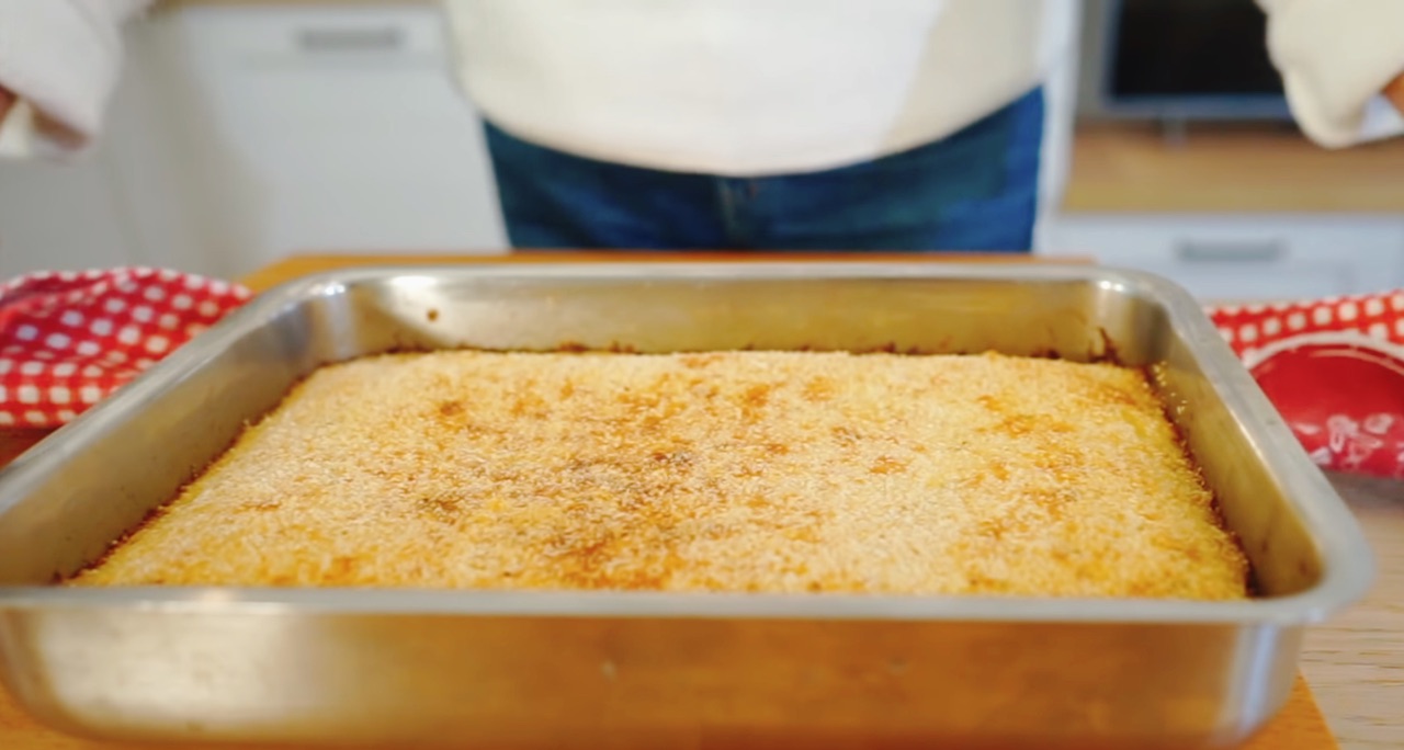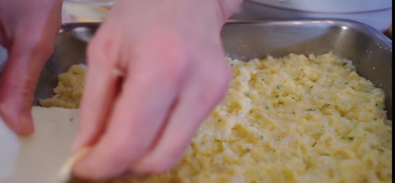 步骤8、在烤盘底部先洒上一层薄薄的面包糠,花菜土豆泥分两次铺,第一层铺上花菜土豆泥、第二层再铺上芝士片、第三层再铺上剩下的花菜土豆泥,烤箱先预热200度十分钟