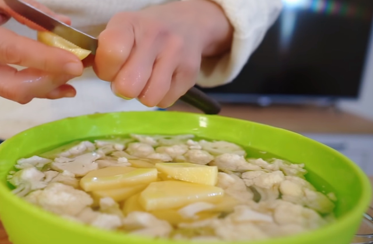 步骤1、先把花菜在盐水里浸泡半小时!然后再次冲洗干净切小块!土豆也去皮切小块!