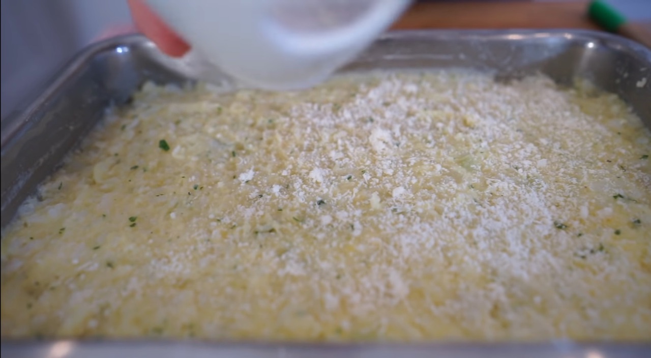 步骤5、干奶酪指的是干奶酪磨成的干的芝士粉!可以在超市买袋装的磨好的!如果对这种奶酪不太喜欢的小伙伴们可以省略这种吧!因为后续还有加芝士片的!
