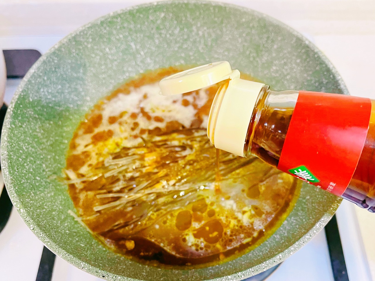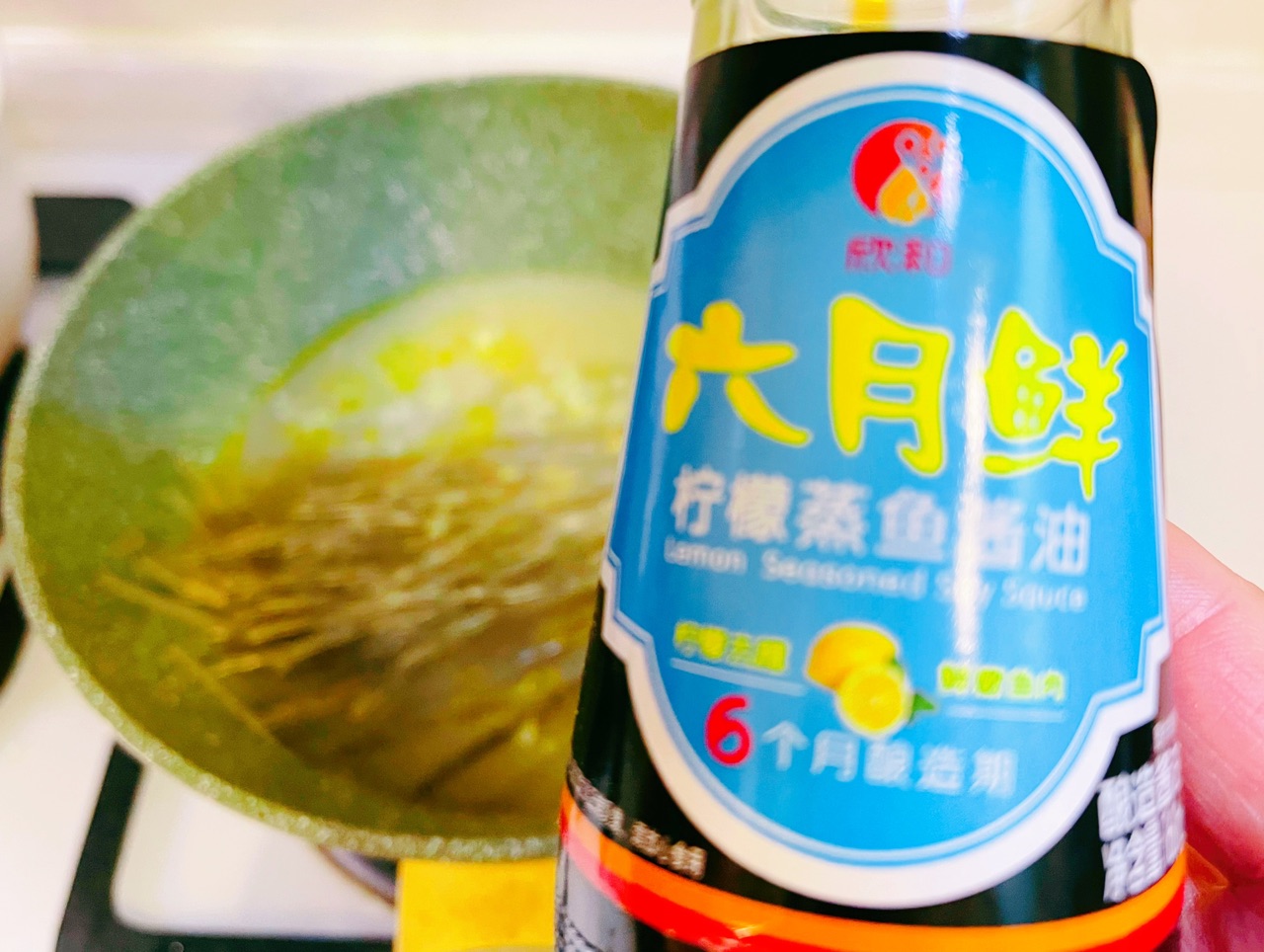 步骤8、加入适量温水或高汤,和一勺六月鲜柠檬蒸鱼酱油