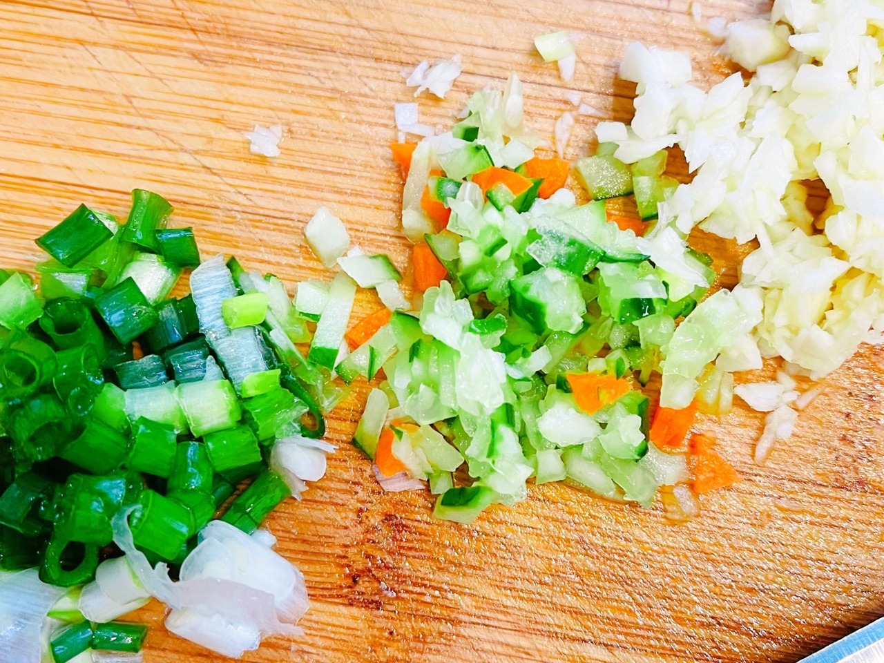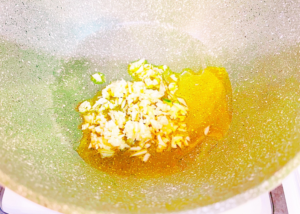 步骤6、开蒸时做粉丝配料,放入食用油适量加入葱姜蒜末(葱先放葱白部分)