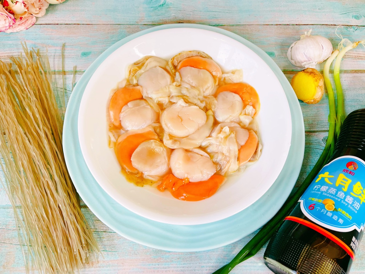 步骤2、食材:扇贝、粉丝、葱姜蒜、六月鲜柠檬蒸鱼酱油