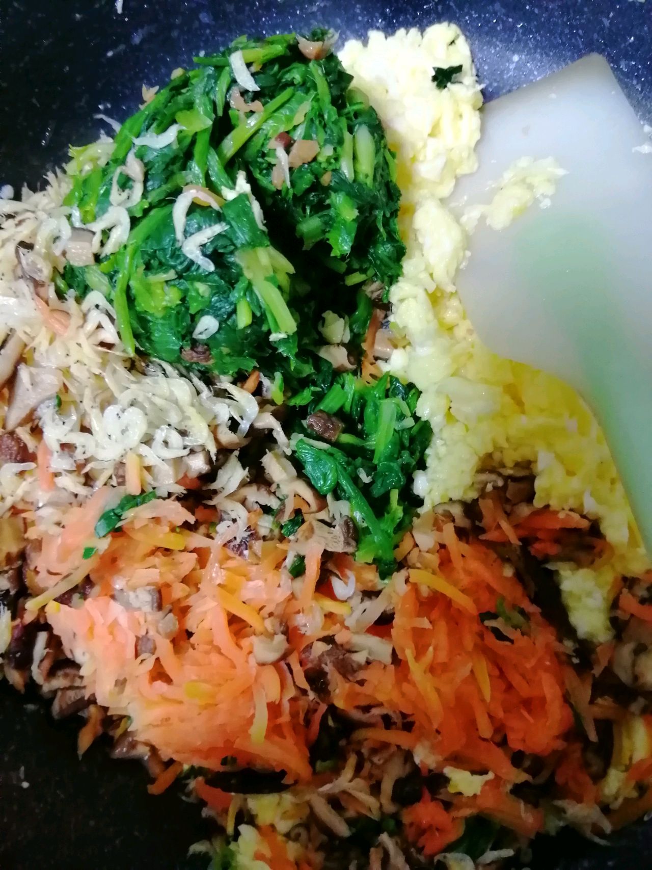 步骤2、菠菜:焯水后切碎攥干水;胡萝卜:擦丝焯水攥干水;香菇:煮一下切丁攥干水;鸡蛋:炒成小碎块(炒的过程快速搅拌);料油:用洋葱姜花椒大料和葱小火煸香。(我的一次多做了料油:花生油200克,洋葱100克、姜30克、花椒10克、八角15克、大葱60克、香叶2片。做料油还可以加入香菜、小茴香、桂皮、蒜末等)再加入盐鸡精和面粉。所有食材放在一起拌匀。