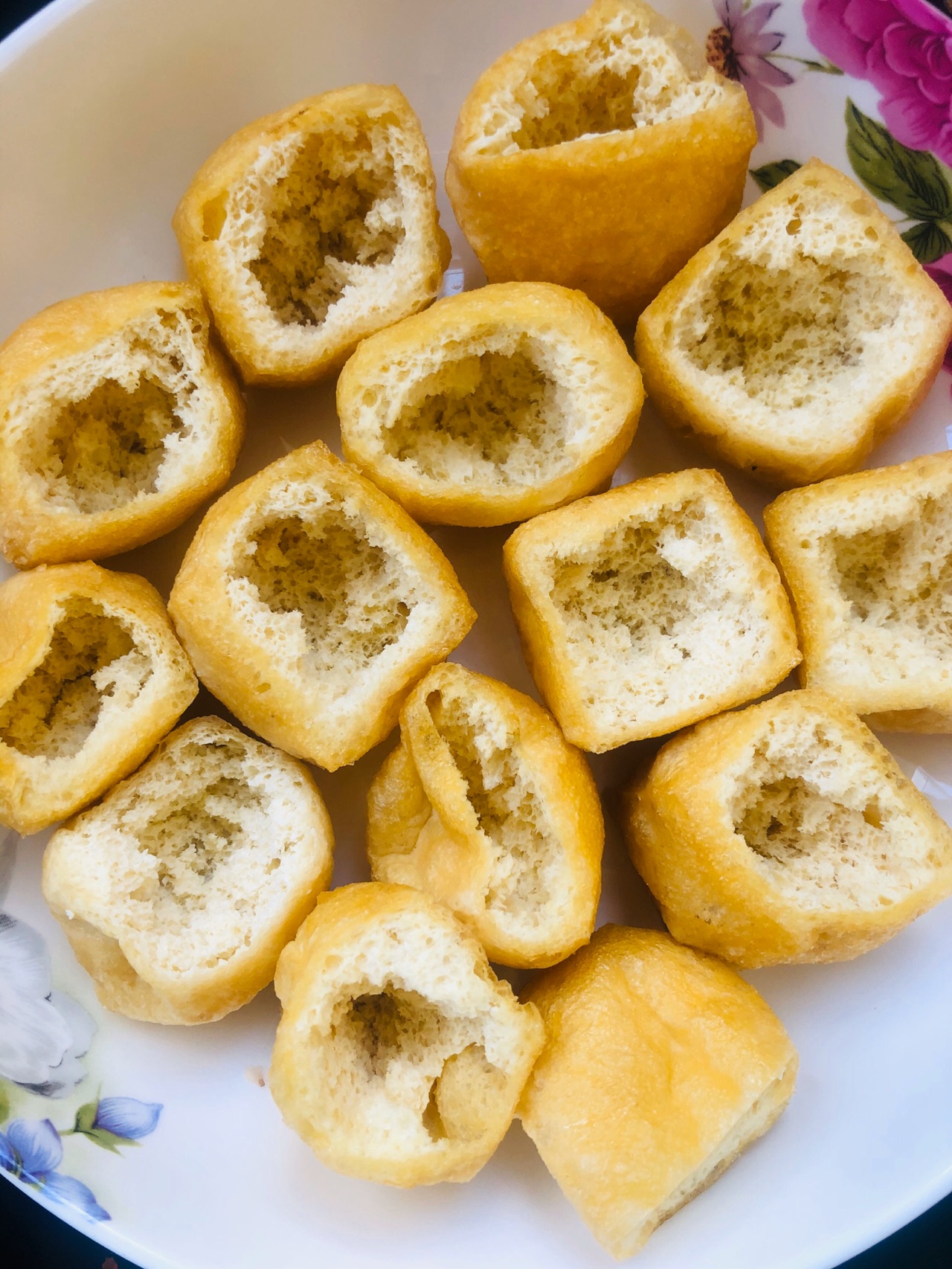 步骤1、把油豆包一面切开里边豆腐适量取出