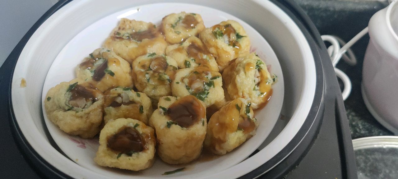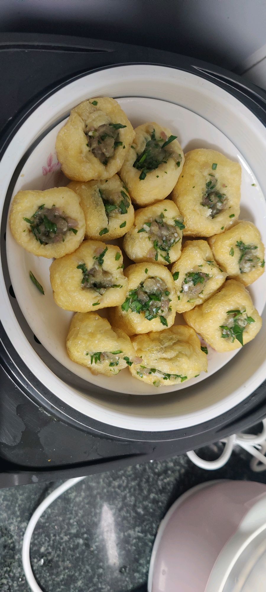 步骤4、把馅料塞进油豆腐里,塞得满满当当。然后放锅里蒸20分钟