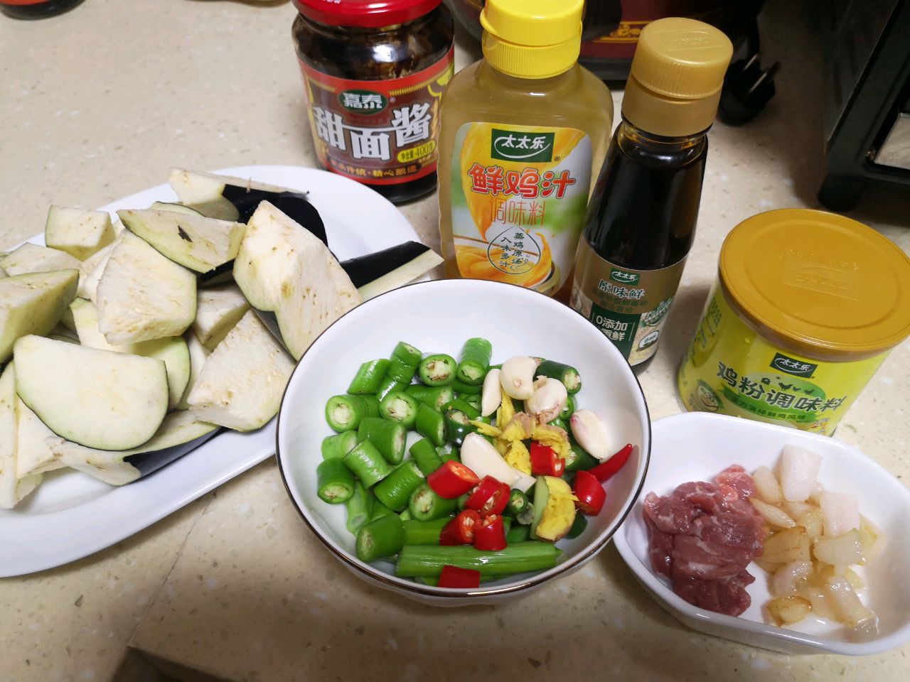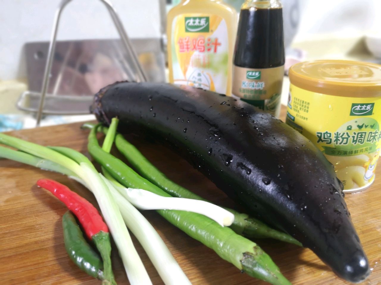 步骤1、准备食材:茄子一根、大葱两根、青椒两个、朝天椒两颗,大蒜五颗