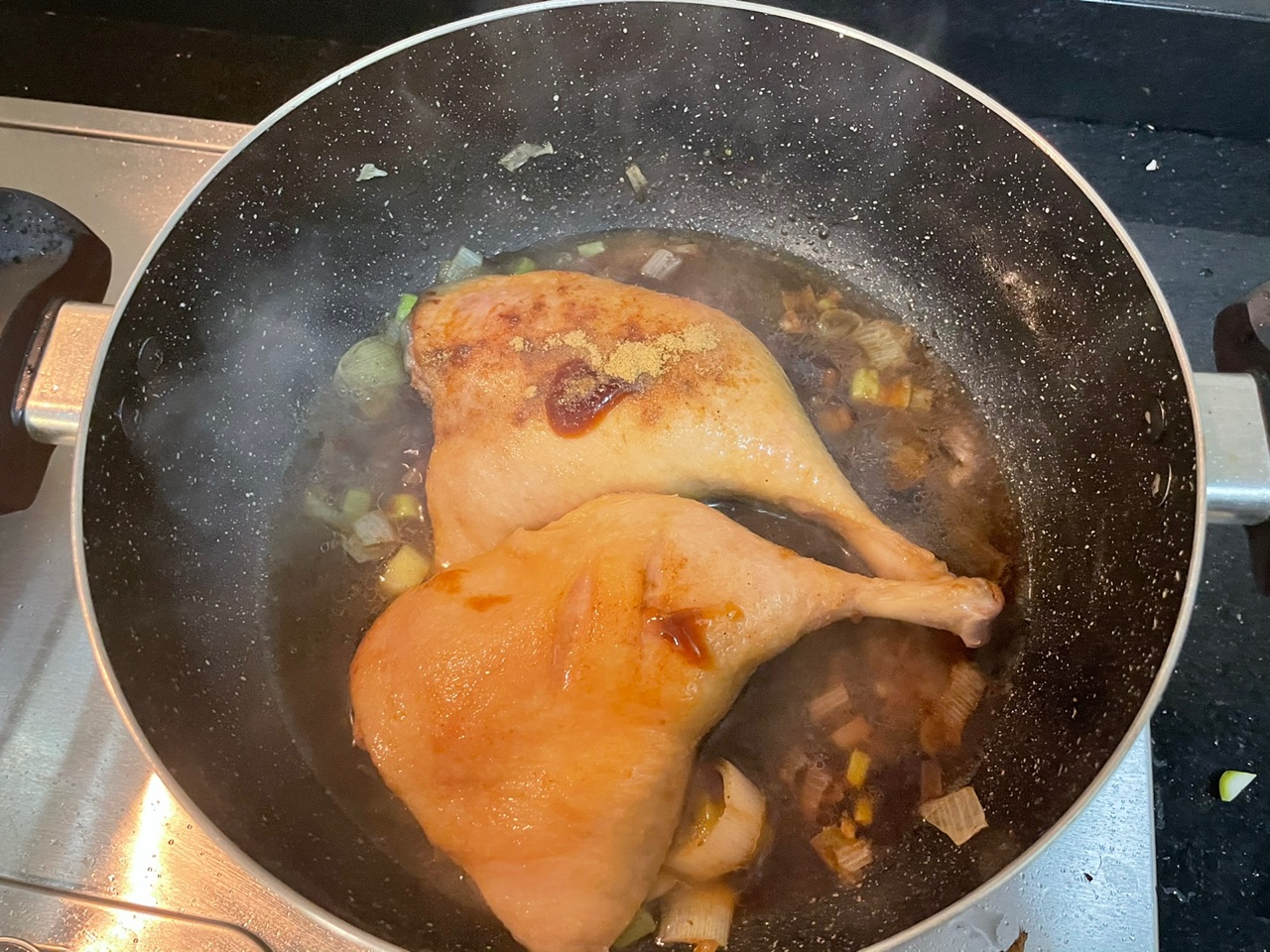 步骤4、把鸭腿放进去,加少量水,在每个鸭腿上放上两块冰糖,用勺子舀热汤,将糖慢慢融化,这样做出来的色泽好。放两勺生抽,两勺老抽,两勺料酒,少许盐,胡椒粉