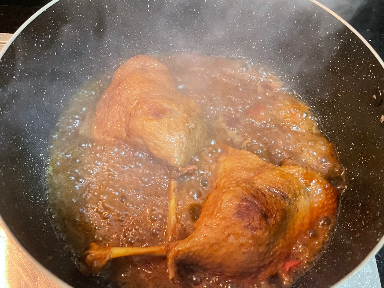 步骤7、最后进行收汁,喜欢吃辣的话,可以在收汁的时候放点小红辣椒。收汁好啦就是超美味的大鸭腿啦!