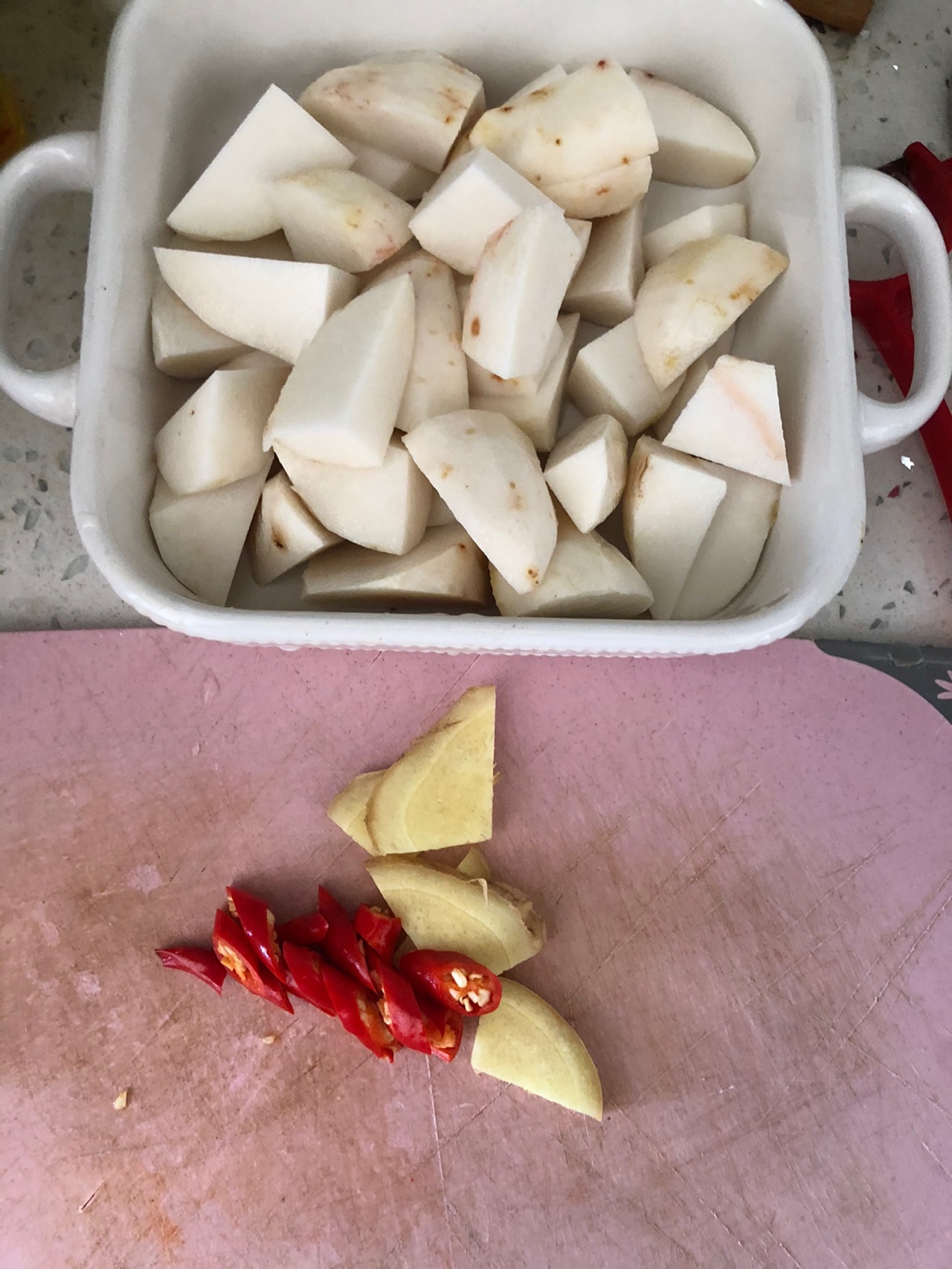 步骤2、戴好手套把芋艿去皮洗净切成小块姜片切小块小米椒切小段备用。