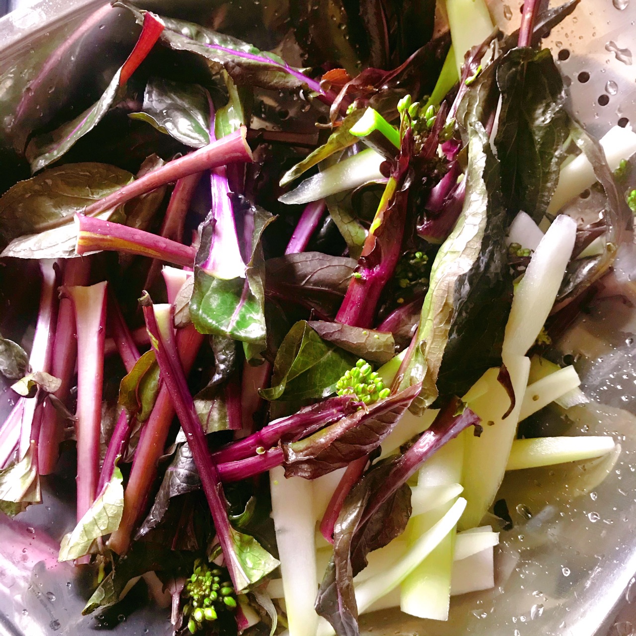 步骤2、红油菜摘取嫩尖、叶,粗的茎去皮,切小,淘洗干净。