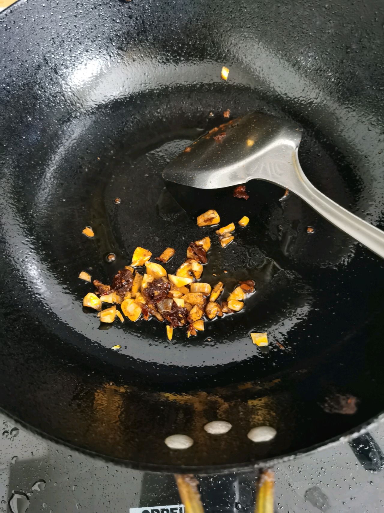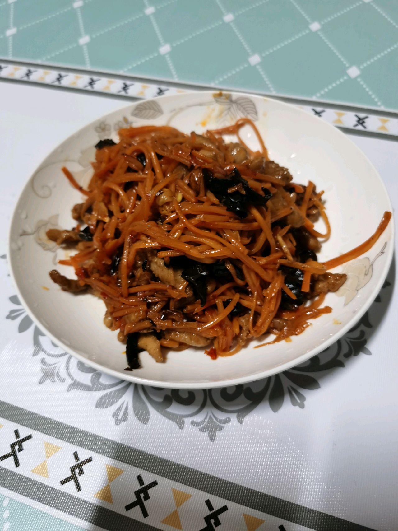 步骤6、放蒜,豆瓣酱,小火,放胡萝卜木耳肉丝,我家没青辣椒了,没放,把调料糖,醋,生抽,耗油放碗里,倒入锅里