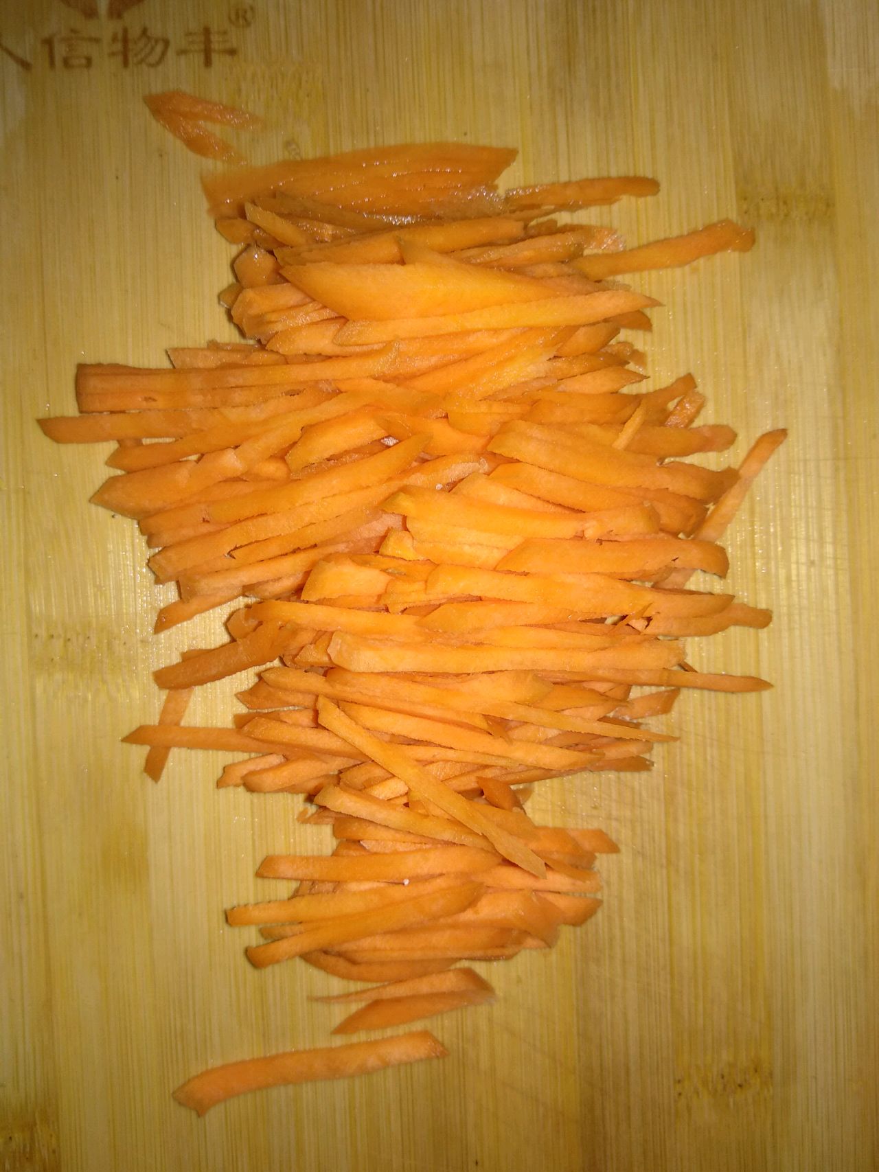 步骤1、春卷,就是把自己喜欢的食材肉类、水果、蔬菜等铺在春卷皮上。卷成条状即可。胡萝卜切丝,