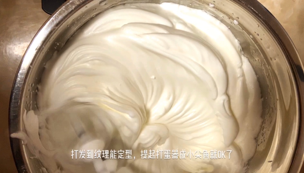 步骤7、打发到纹理能定型,提起打蛋器成小尖角就OK了