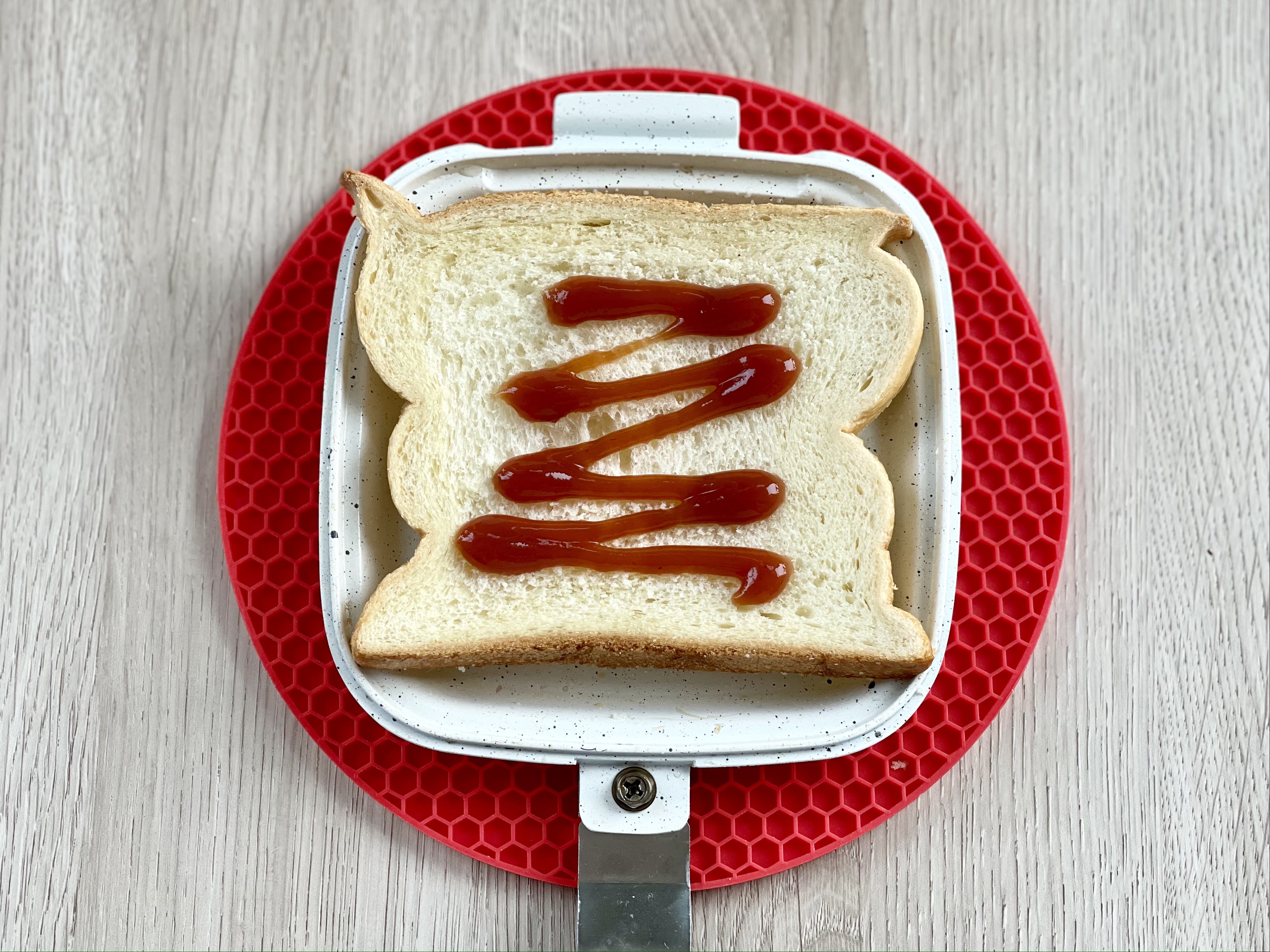 步骤5、在三明治烤盘中放一片吐司,挤上番茄酱。