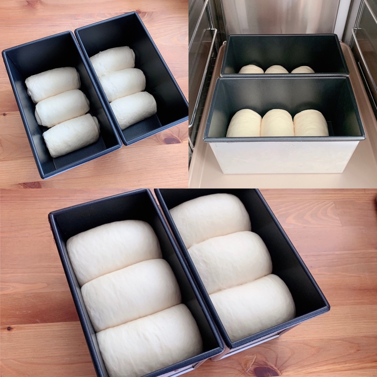 步骤9、3个一组放入吐司模内;在温暖湿润(32-36度)的环境中进行最后发酵;发至模具八分满;