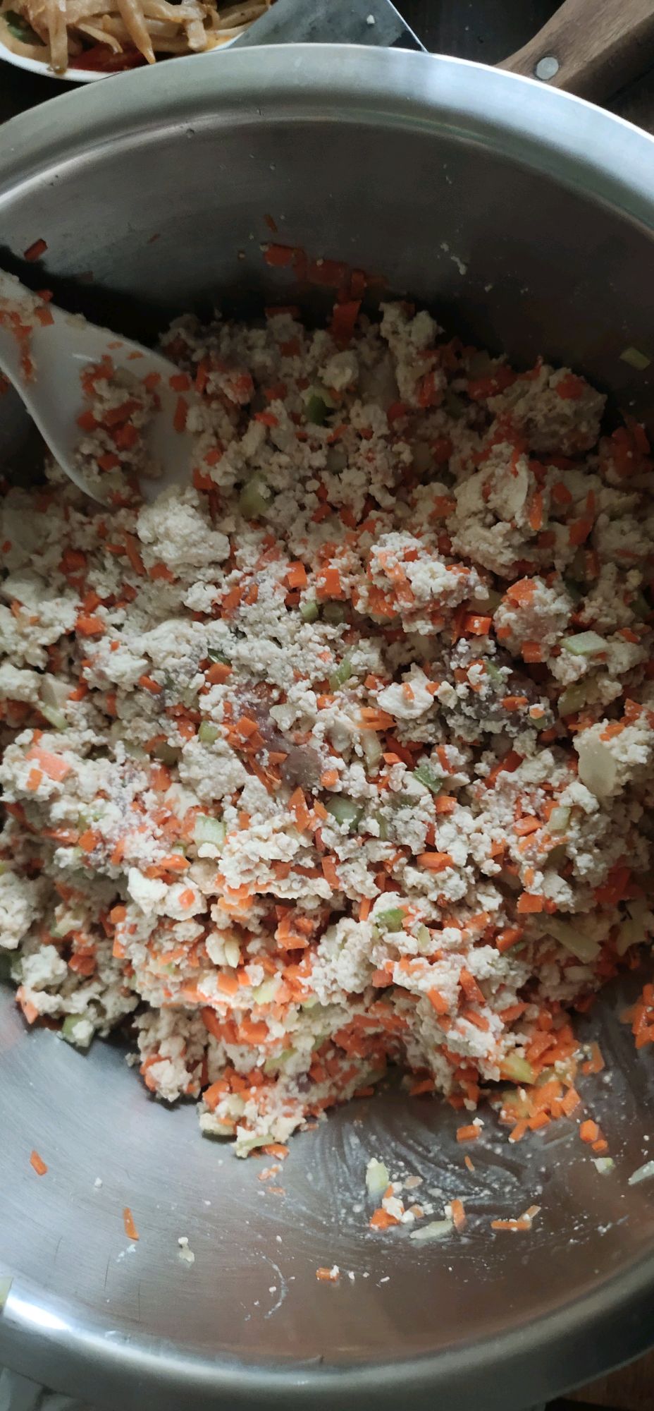 步骤4、胡萝卜芹菜切碎,放一个公鸡蛋