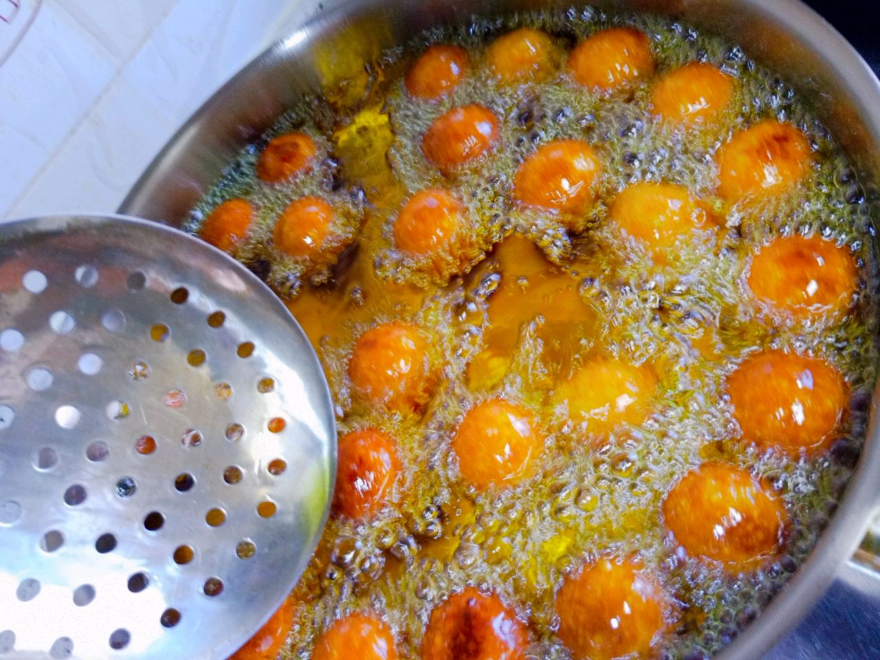 步骤3、中小火加热半锅油,下丸子时候用筷子推一下丸子,不要让丸子黏底