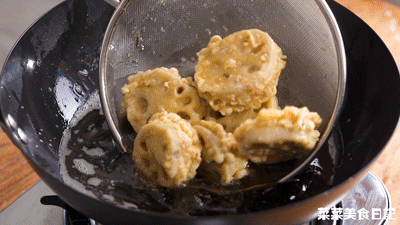 步骤11、裹好肉馅的藕夹,挂上浆,放入四五成的油温,炸2-3分钟,炸至金黄