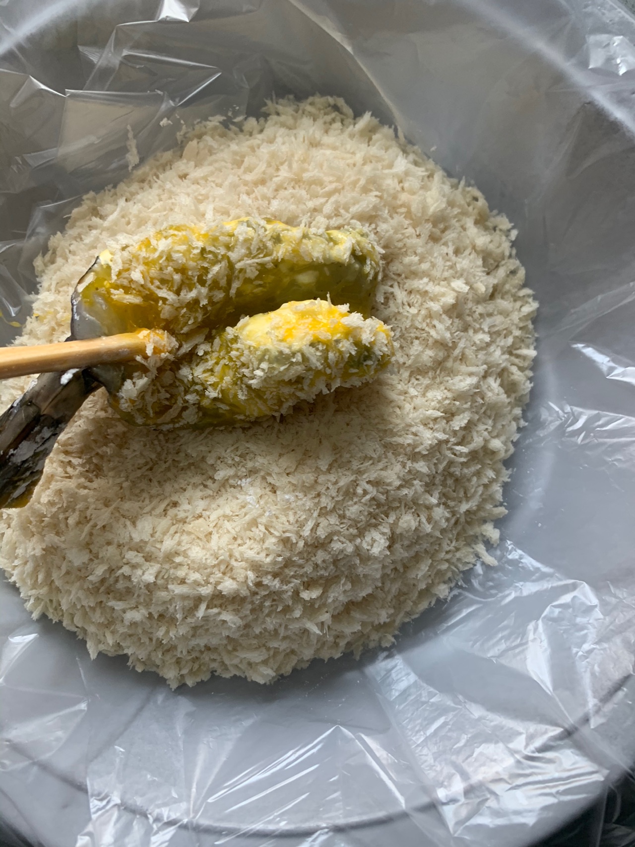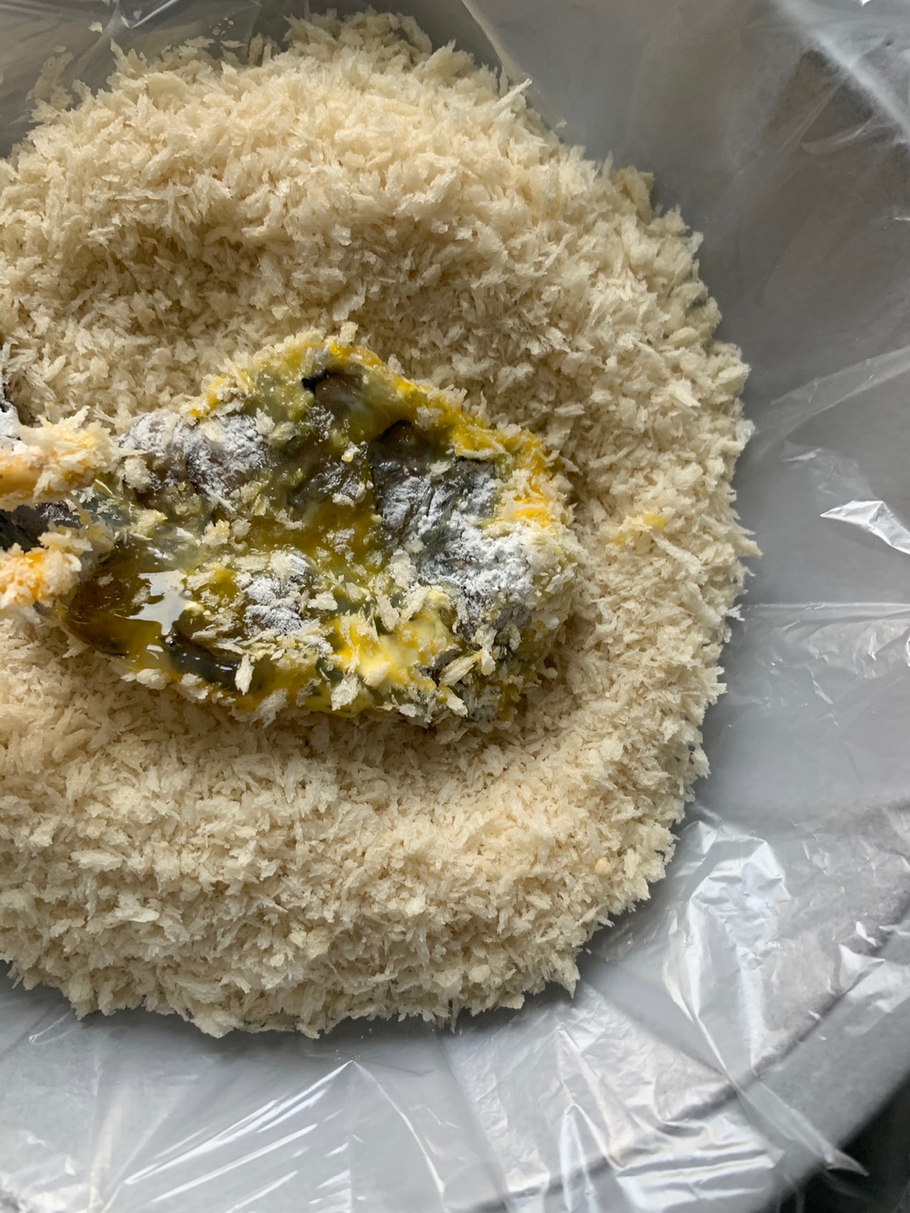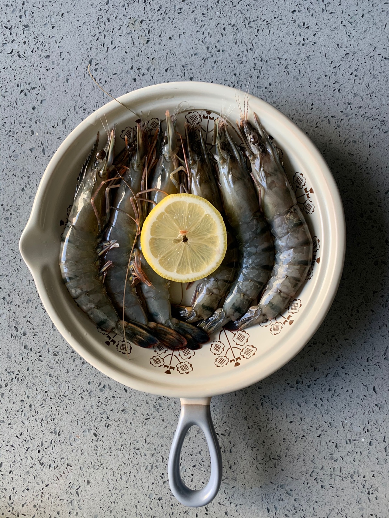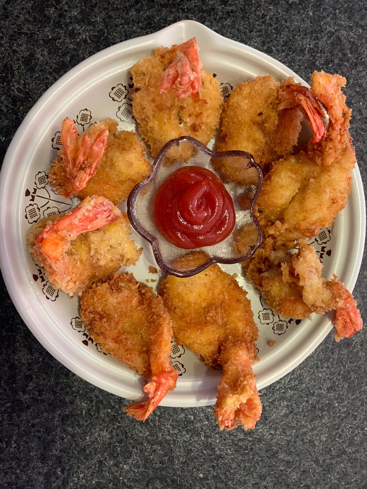 辅料:柠檬汁适量、盐1克、黑胡椒粉少许、需要裹浆部分、鸡蛋2个、面包糠适量、玉米淀粉适量、番茄酱蘸料用来蘸虾排吃的2勺、炸虾排玉米油1500
