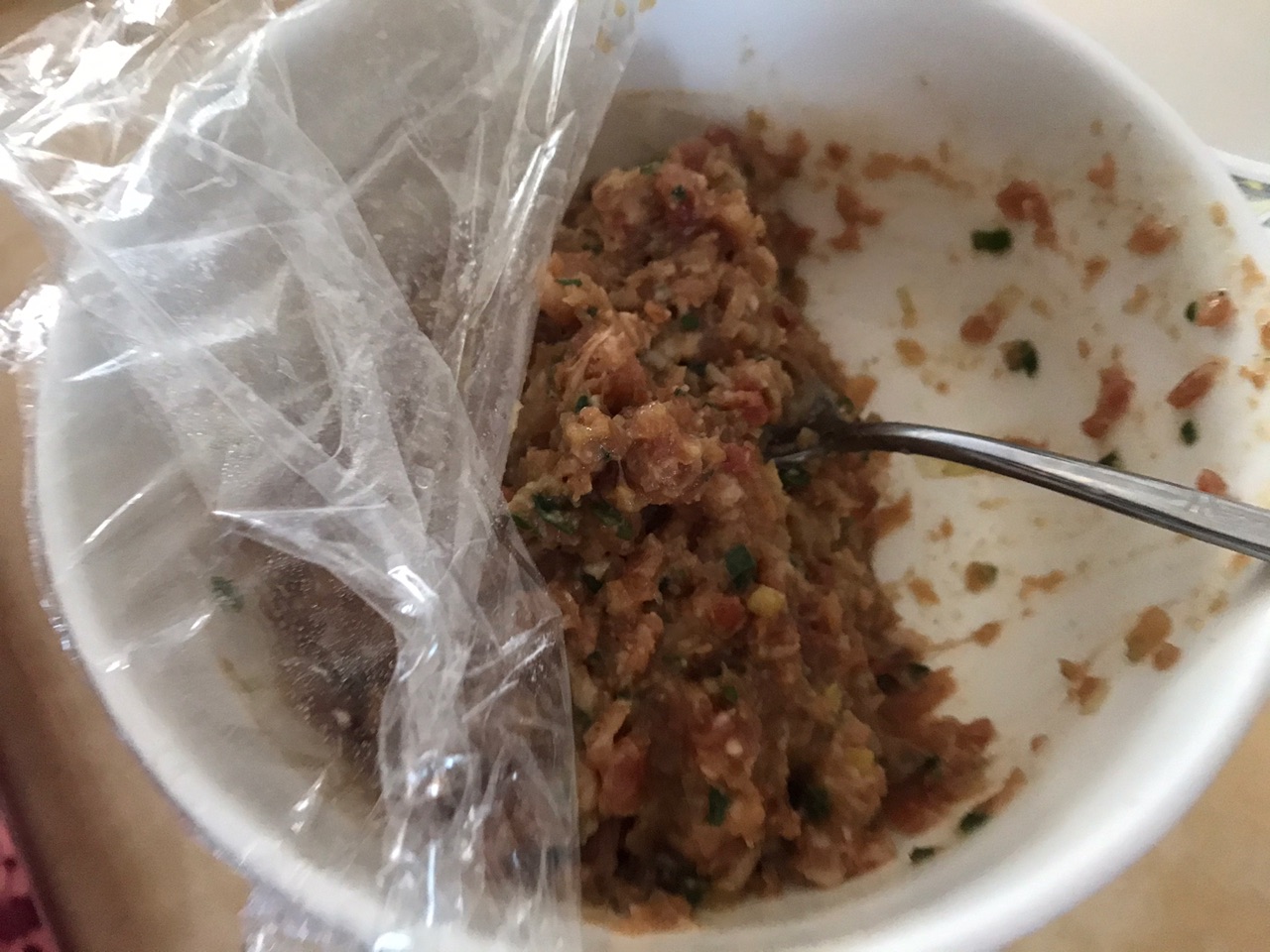 步骤1、先调肉馅,猪肉白菜,加生抽、白糖、蛋清。