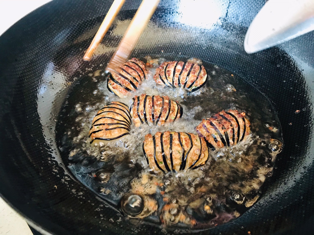 步骤2、没来得及拍中间了,切茄子时注意底端别切段,片稍薄,塞入肉馅,油温六成热下锅,炸至金黄就可以出锅了